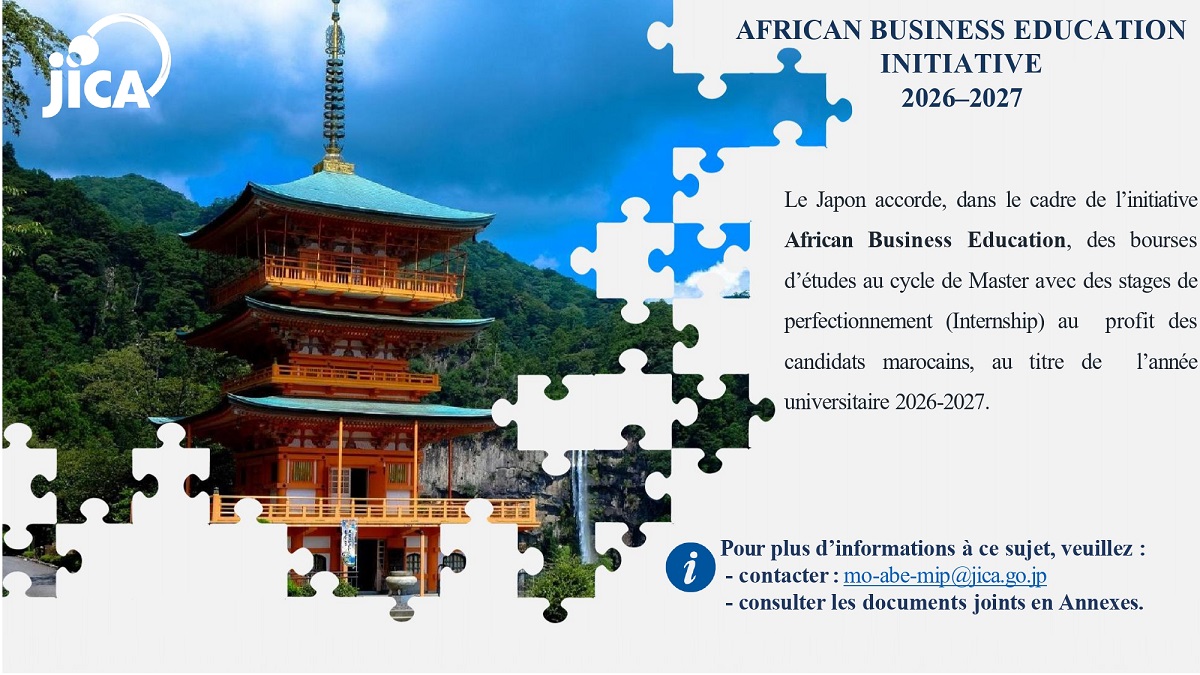 برنامج ABE، منحة دراسية وتدريب في الشركات اليابانية: تُعدّ اليابان وجهةً رائدةً للدراسة والابتكار، وتقدم الآن فرصةً ذهبيةً للشباب المغربي الطموح. في إطار مبادرة التعليم الأفريقي للأعمال (African Business Education – ABE)، تمنح اليابان مجموعةً من المنح الدراسية لمتابعة دراسات الماجستير في جامعاته المرموقة، مع إتاحة فرص للتدريب المهني (Internship) في الشركات اليابانية. تستهدف هذه المبادرة العام الأكاديمي 2026-2027 وتفتح آفاقًا جديدةً للطلاب والموظفين في القطاعين العام والخاص لتطوير مهاراتهم ومعارفهم في بيئة دولية.