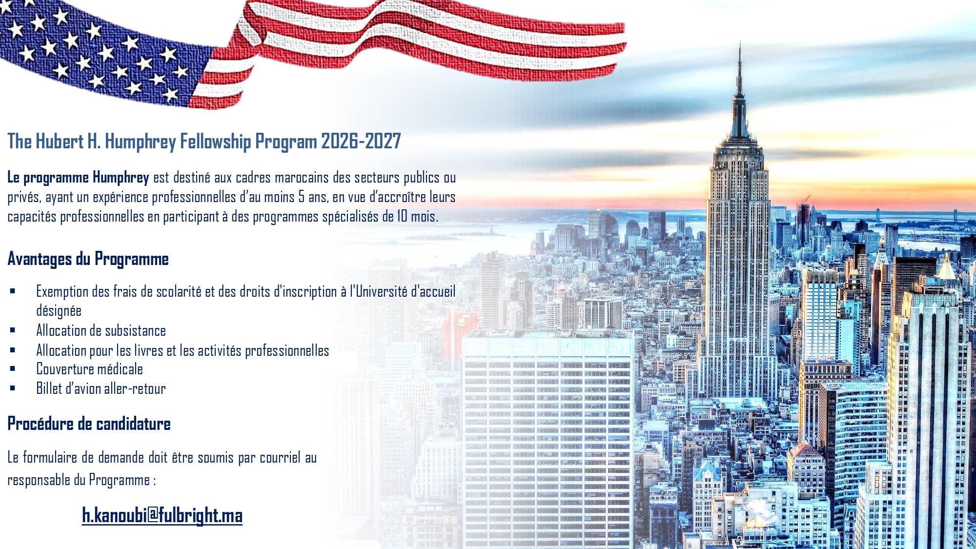 Bourses d’études en États-Unis d’Amérique Programme Humphrey 2026-2027, Le programme Humphrey est destiné aux cadres marocains des secteurs publics ou privés, ayant un expérience professionnelles d’au moins 5 ans, en vue d’accroître leurs capacités professionnelles en participantà des programmes spécialisés de 10 mois.