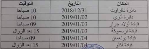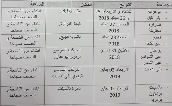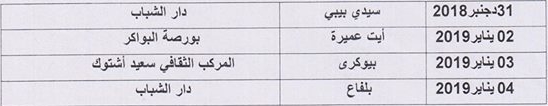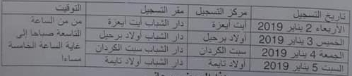 سيتم تسجيل المرشحات بالمراكز والتواريخ التالية. علما أن التسجيل مفتوح بمقر الوكالة (وكالة الحوز) طيلة العملية من 25 دجنبر 2018 إلى 04 يناير 2019. التسجيل بالمراكز سيتم بمقر الدائرة بتنسيق مع السلطة المحلية: