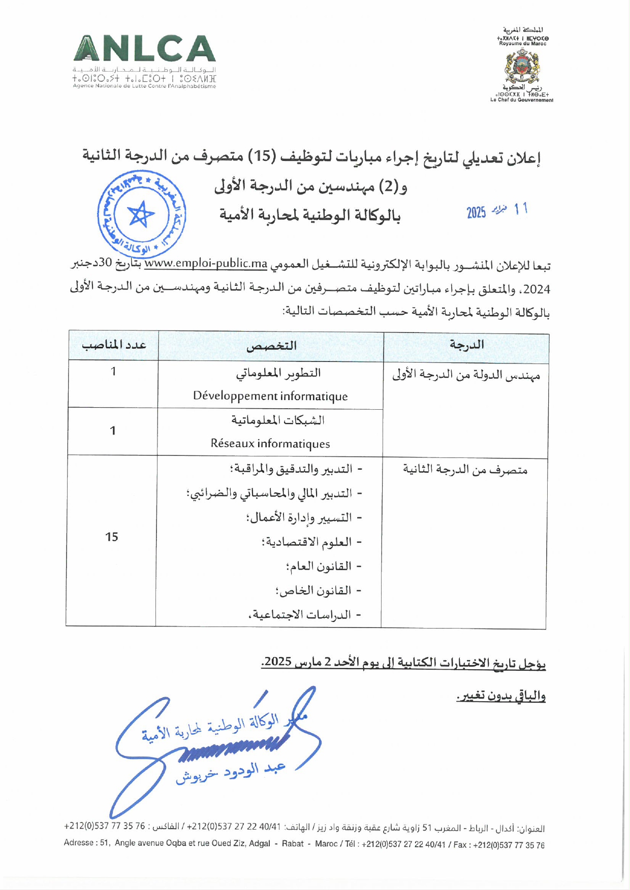 إعلان تعديلي لتاريخ إجراء مباراة توظيف 17 منصب بالوكالة الوطنية لمحاربة الأمية 2025