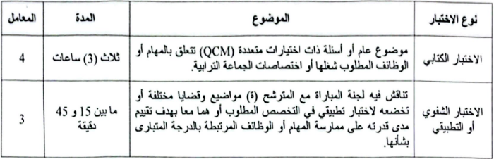 تشتمل المباراة على اختبار كنابي واحد واختبار شفوي أو تطبيقي، تحدد مدتهما ومعاملاتهما كالتالي:
