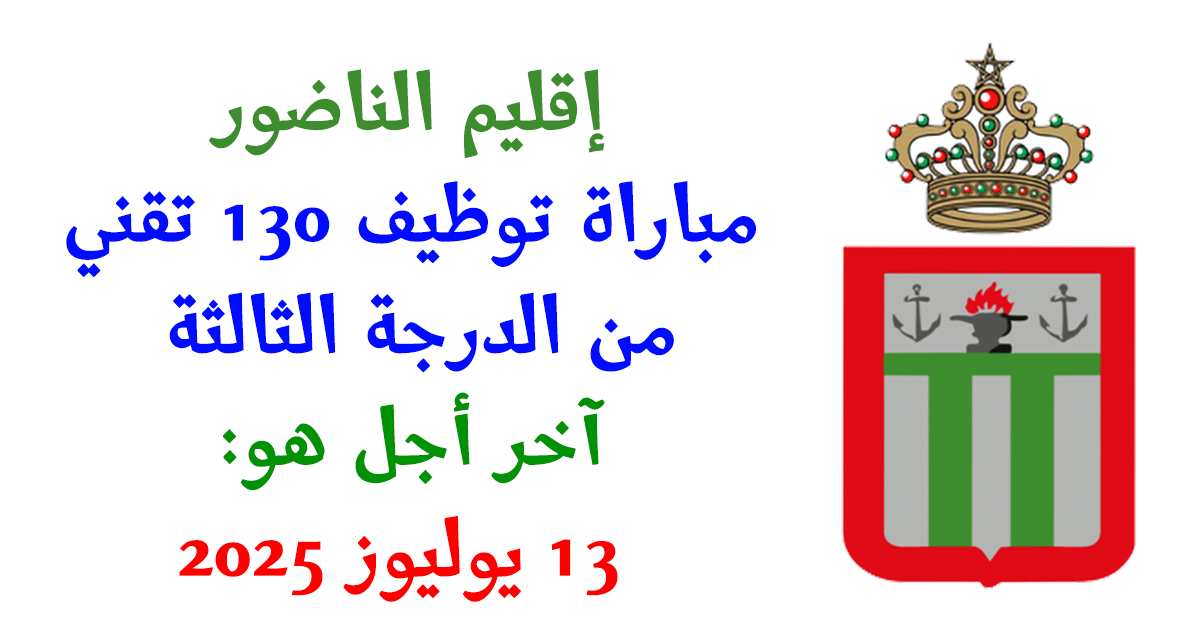 إعلان عن تنظيم مباراة مشتركة للتوظيف في درجة تقني من الدرجة الثالثة (130) منصب لفائدة الجماعات الترابية التابعة لإقليم الناظور وذلك يوم الأحد 13 يوليوز 2025.