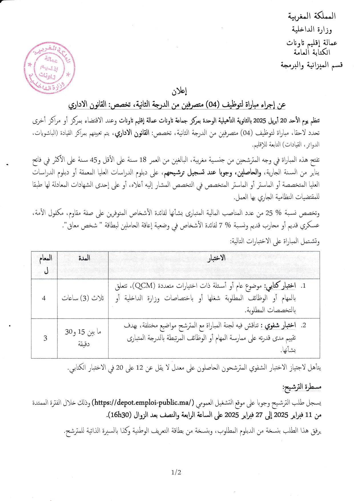 مباراة توظيف 12 متصرف من الدرجة الثانية بإقليم تاونات ويعتبر آخر أجل هو يوم 27 فبراير 2025.