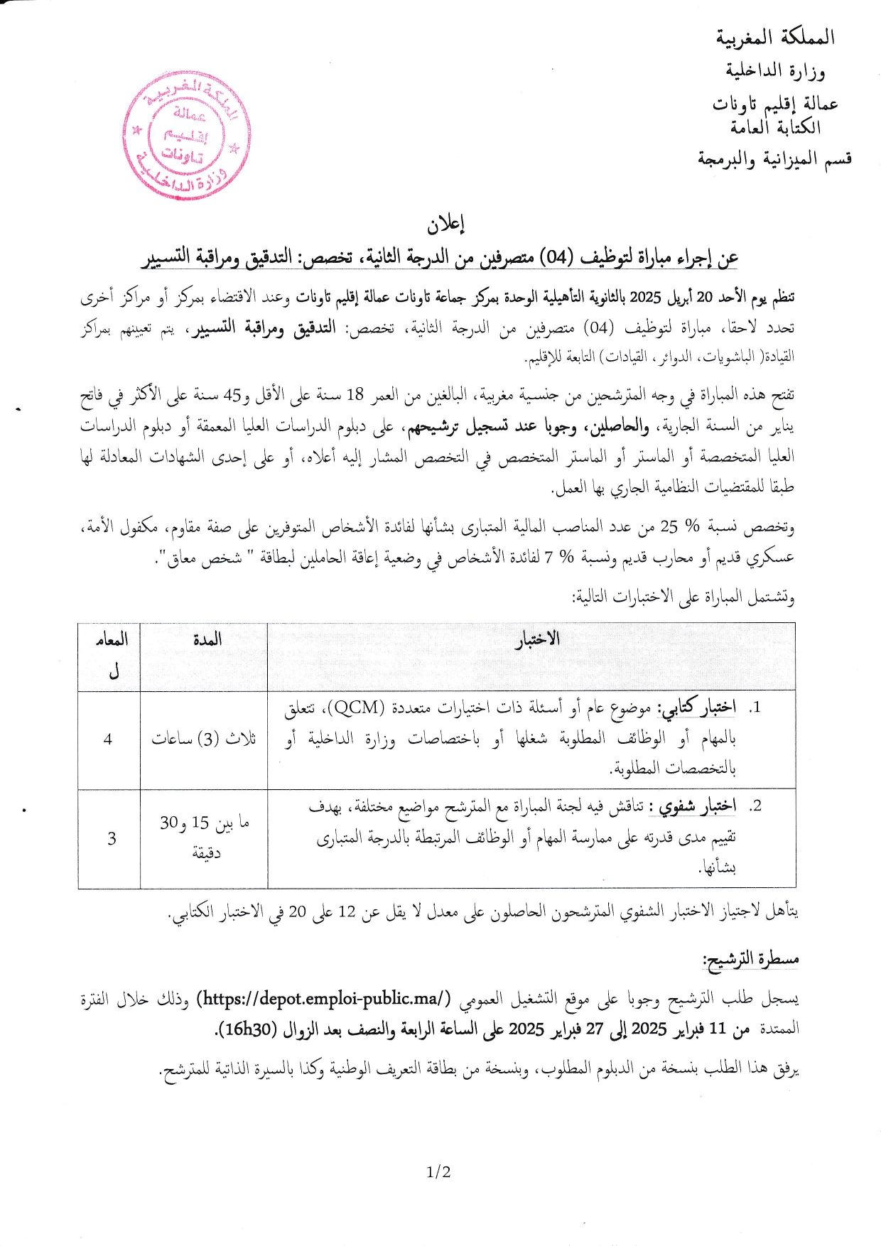 مباراة توظيف 12 متصرف من الدرجة الثانية بإقليم تاونات 2025