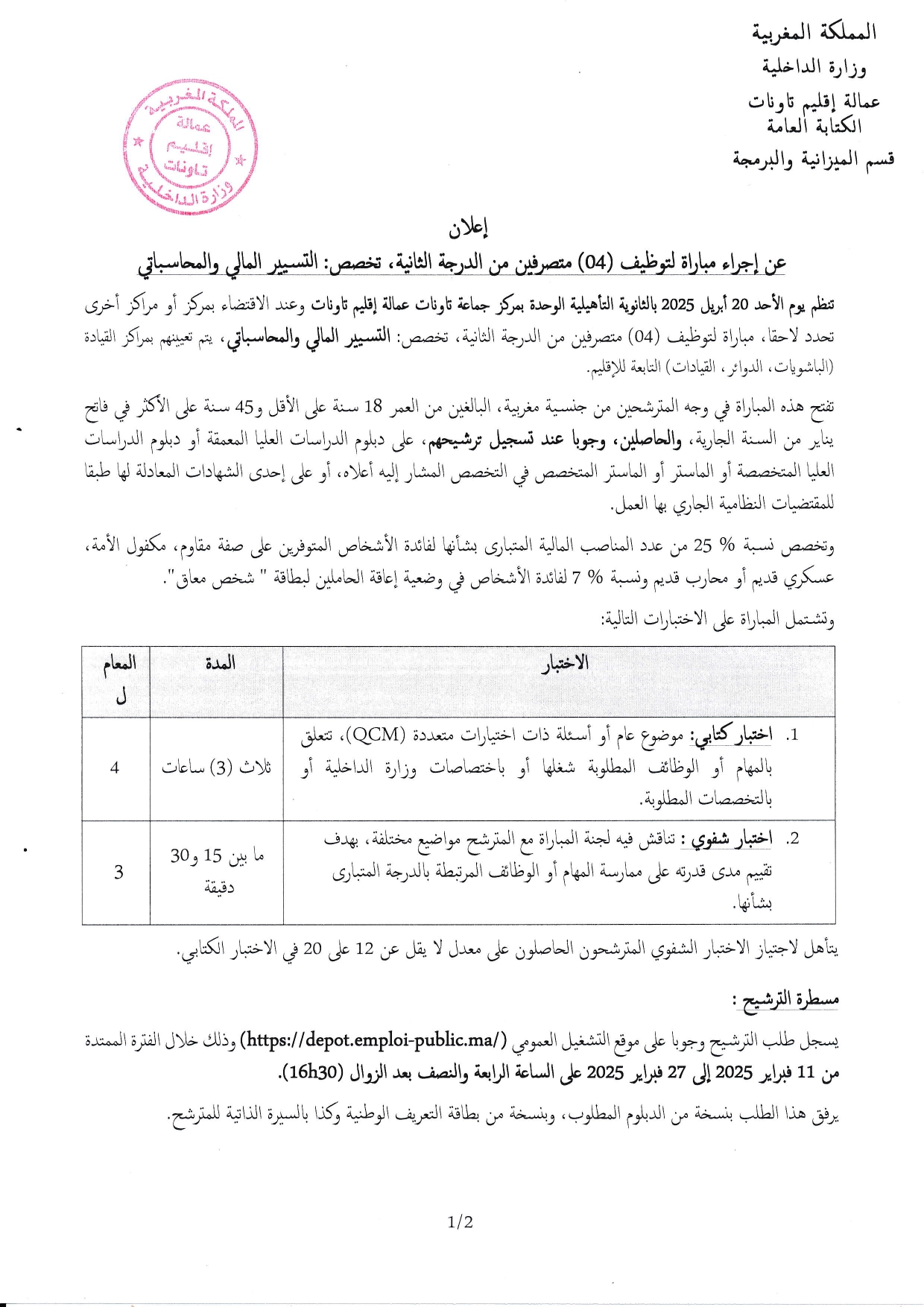 إقليم تاونات: مباراة توظيف 12 متصرف من الدرجة الثانية. آخر أجل 27 فبراير 2025