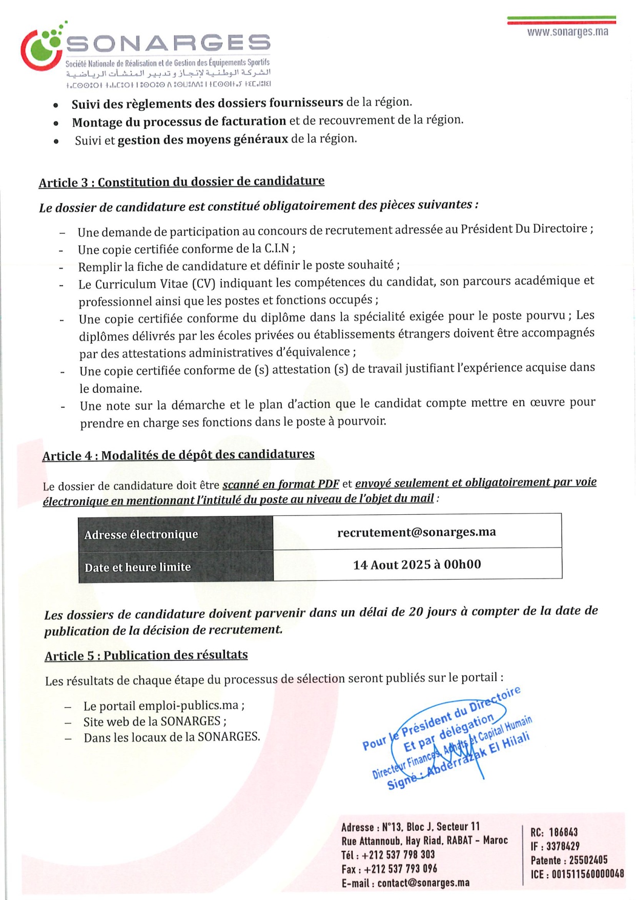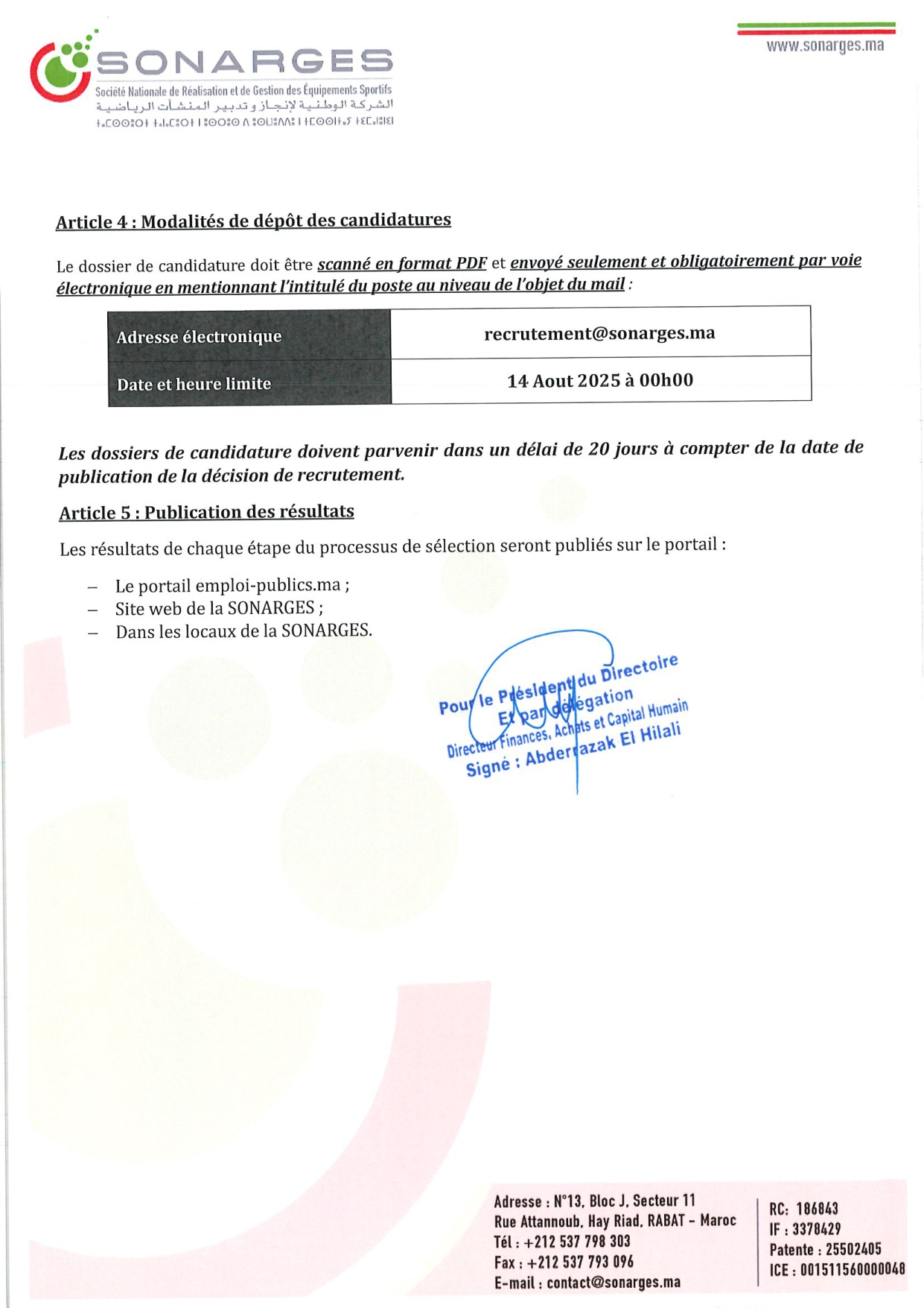 يجب إرسال ملف الترشيح، الممسوح ضوئيًا بصيغة PDF، حصرًا عبر البريد الإلكتروني. من الضروري ذكر مسمى الوظيفة في خانة الموضوع عند الإرسال إلى العنوان التالي: recrutement@sonarges.ma