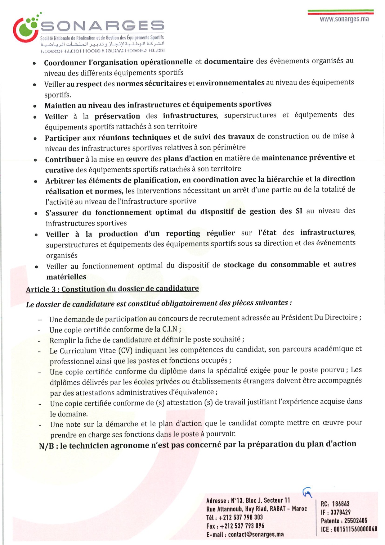 تنظم الشركة الوطنية لإنجاز وتدبير المنشآت الرياضية (SONARGES) مباراة توظيف لـ 9 مناصب موزعة كالتالي: