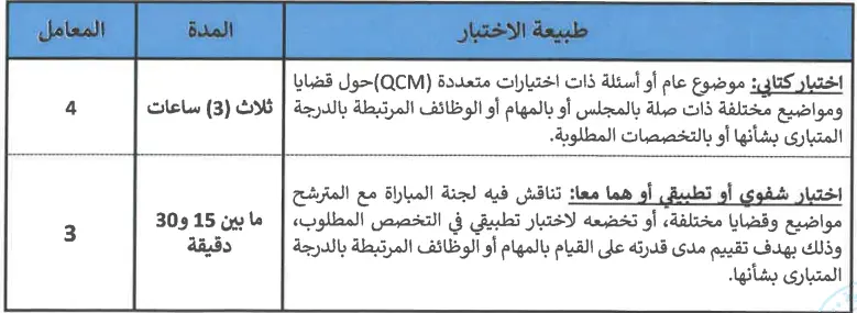 تشتمل المباراة المذكورة على اختبار كتابي واختبار شفوي وفق ما يلي: