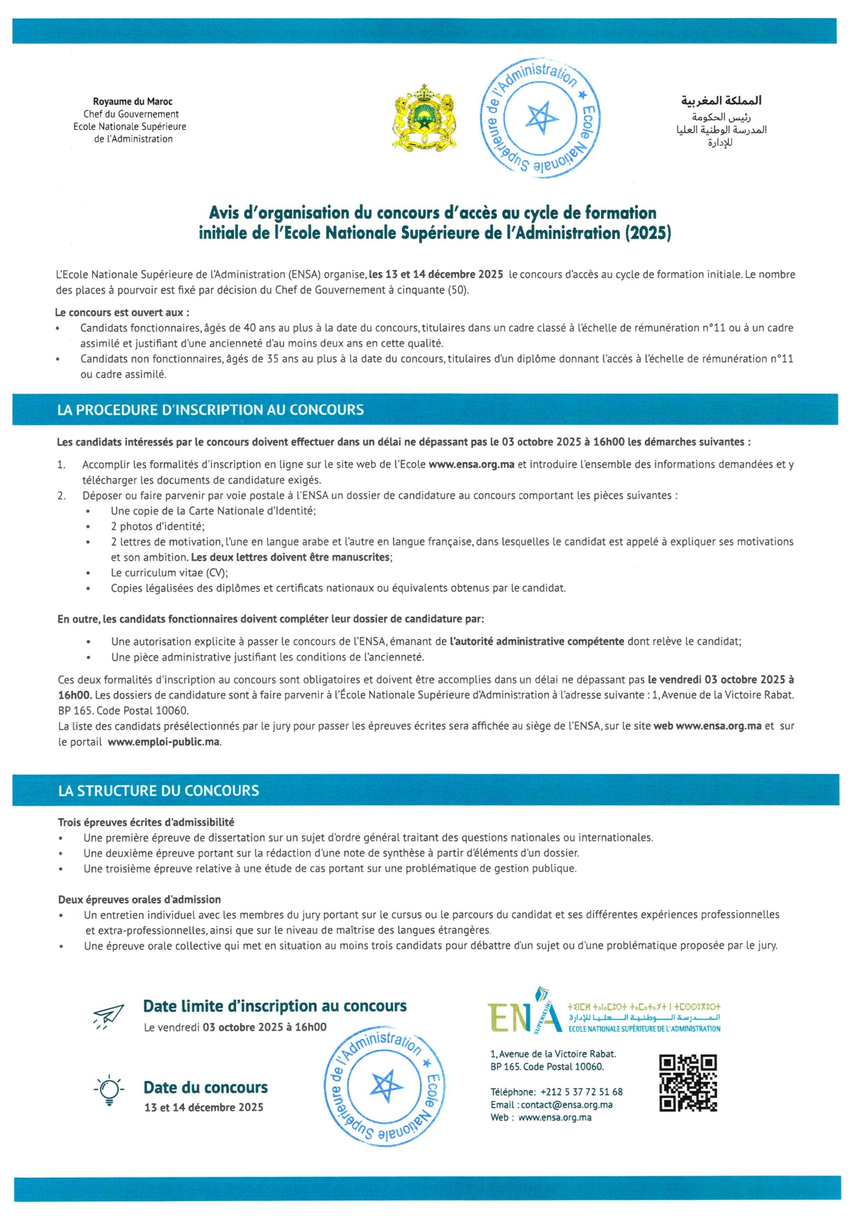 بناءً على القانون رقم 038.13 والنصوص التنظيمية ذات الصلة، تنظم المدرسة الوطنية العليا للإدارة (ENSA) مباراة ولوج سلك التكوين الأساسي يومي 13 و 14 ديسمبر 2025. وقد تم تحديد عدد المقاعد المخصصة لهذه المباراة بخمسين مقعدًا (50).