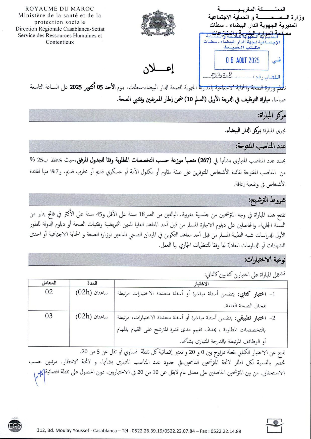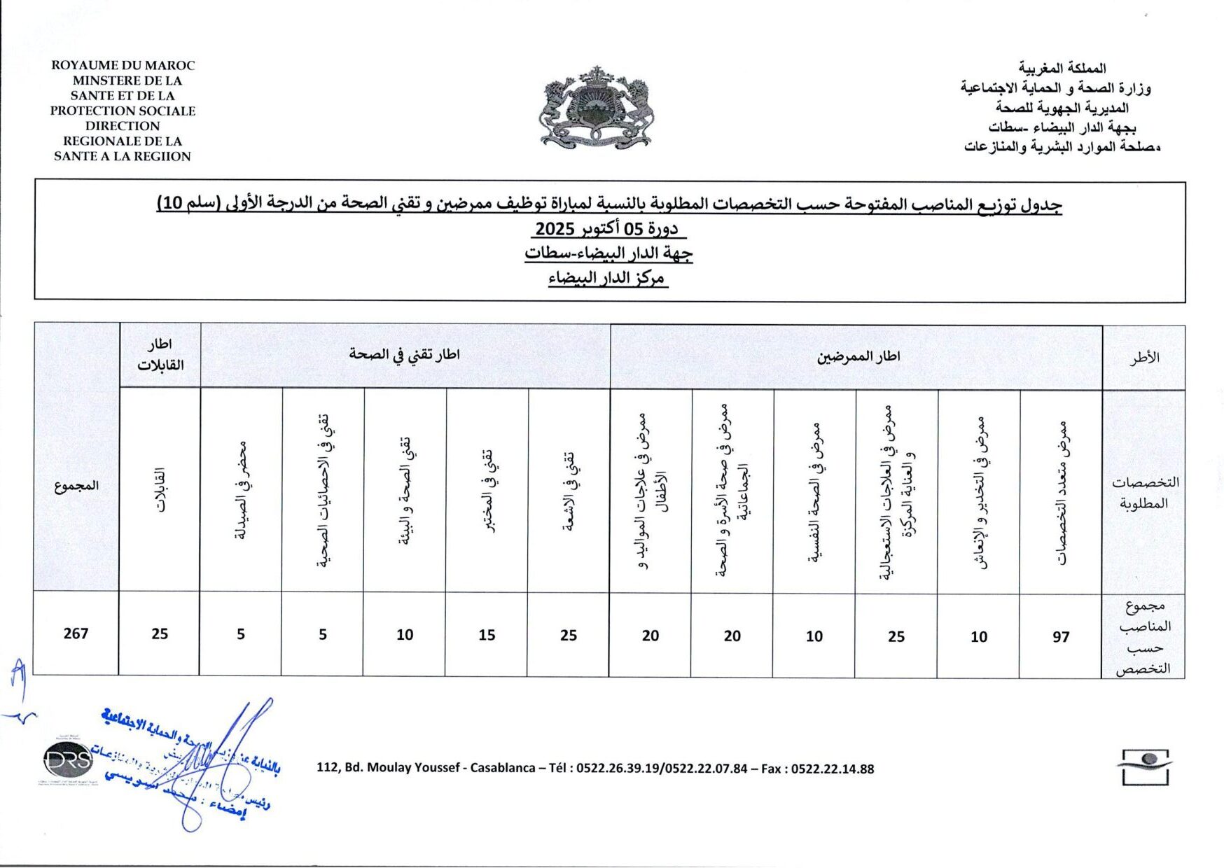 تعلن وزارة الصحة والحماية الاجتماعية، بالمديرية الجهوية للصحة والحماية الاجتماعية بجهة الدار البيضاء – سطات، عن تنظيم مباراة لتوظيف 267 منصبًا في الدرجة الأولى (السلم 10) ضمن إطار الممرضين وتقنيي الصحة. ستُجرى المباراة يوم الأحد 05 أكتوبر 2025، على الساعة التاسعة صباحًا في مركز الدار البيضاء.
