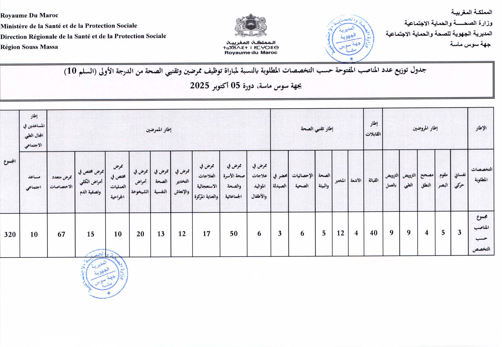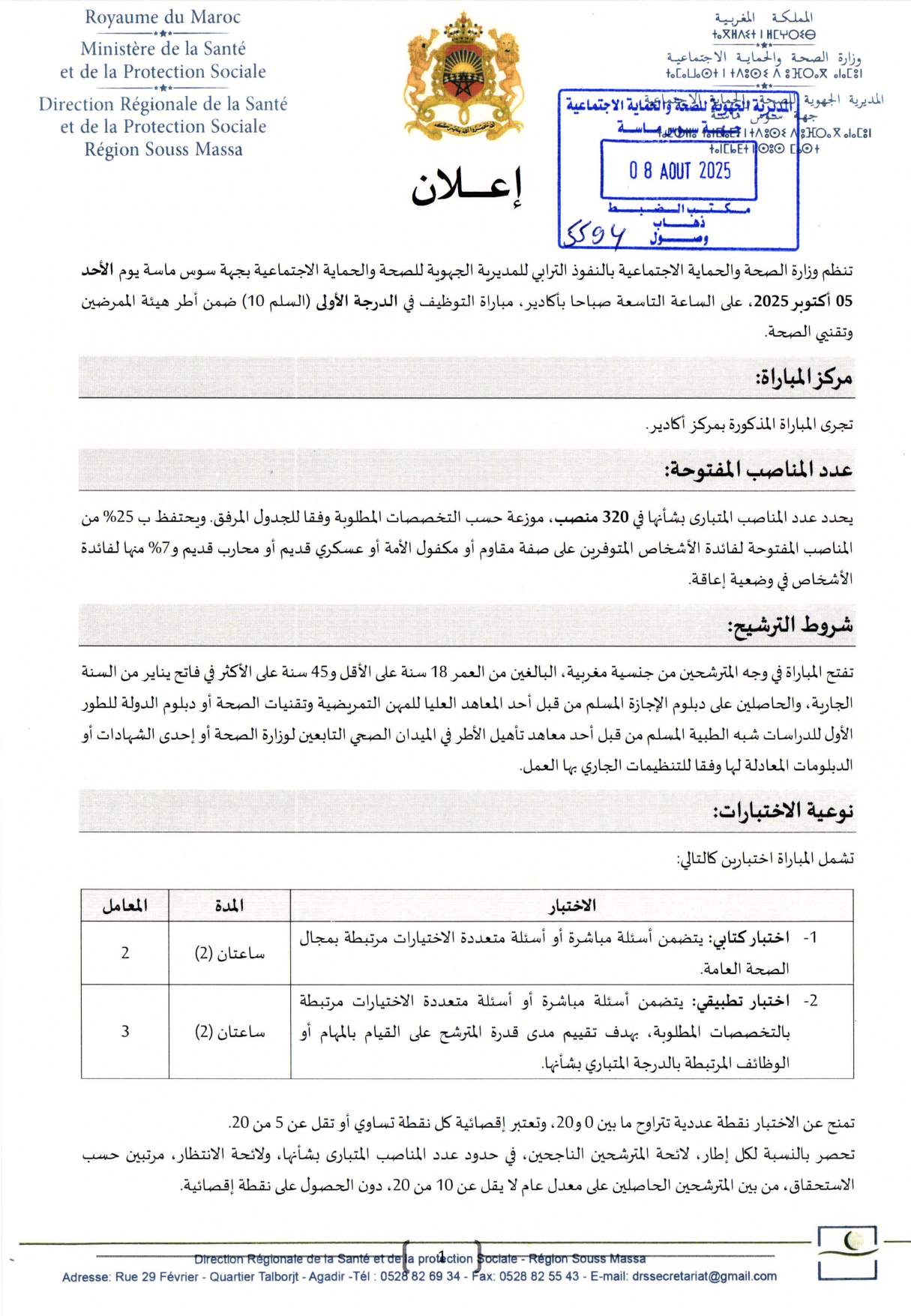 وزارة الصحة والحماية الاجتماعية، المديرية الجهوية للصحة والحماية الاجتماعية بجهة سوس ماسة، تنظم يوم الأحد 5 أكتوبر 2025، على الساعة التاسعة صباحاً بأكادير، مباراة توظيف في الدرجة الأولى (السلم 10) ضمن أطر هيئة الممرضين وتقنيي الصحة.
