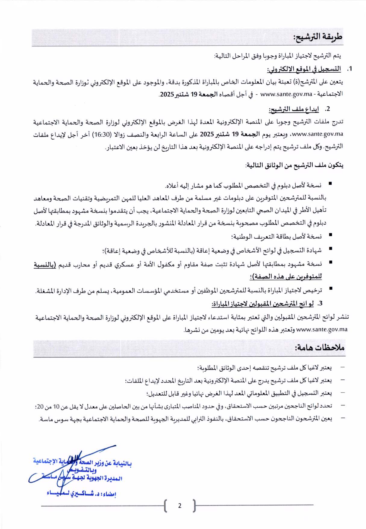 - يتم الترشيح عبر التسجيل في الموقع الإلكتروني لوزارة الصحة والحماية الاجتماعية، www.sante.gov.ma، وملء استمارة المعلومات بدقة.