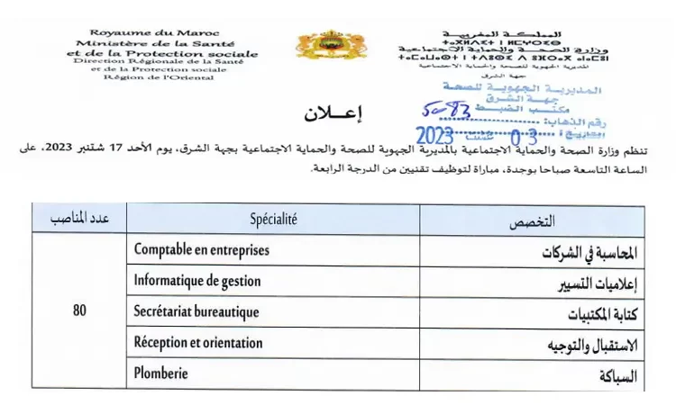 مباراة توظيف 80 تقني من الدرجة الرابعة بالمديرية الجهوية للصحة والحماية الاجتماعية بجهة الشرق يعتبر يوم 22 غشت 2023 آخر أجل لإيداع الترشيحات.