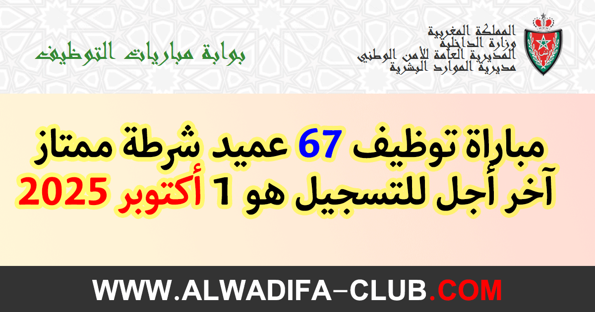 تنظم المديرية العامة للأمن الوطني يوم 14 دجنبر 2025، بالرباط وبمدن أخرى إذا استوجب ذلك عدد المترشحين، مباراة لتوظيف سبعة وستين (67) عميد شرطة ممتاز برسم السنة المالية 2025 في التخصصات المشار إليها في الجدول أسفله. يحتفظ منها بنسبة 25% لفائدة قدماء المحاربين أو قدماء العسكريين أو المتوفرين على صفة مقاوم أو مكفول الأمة.
