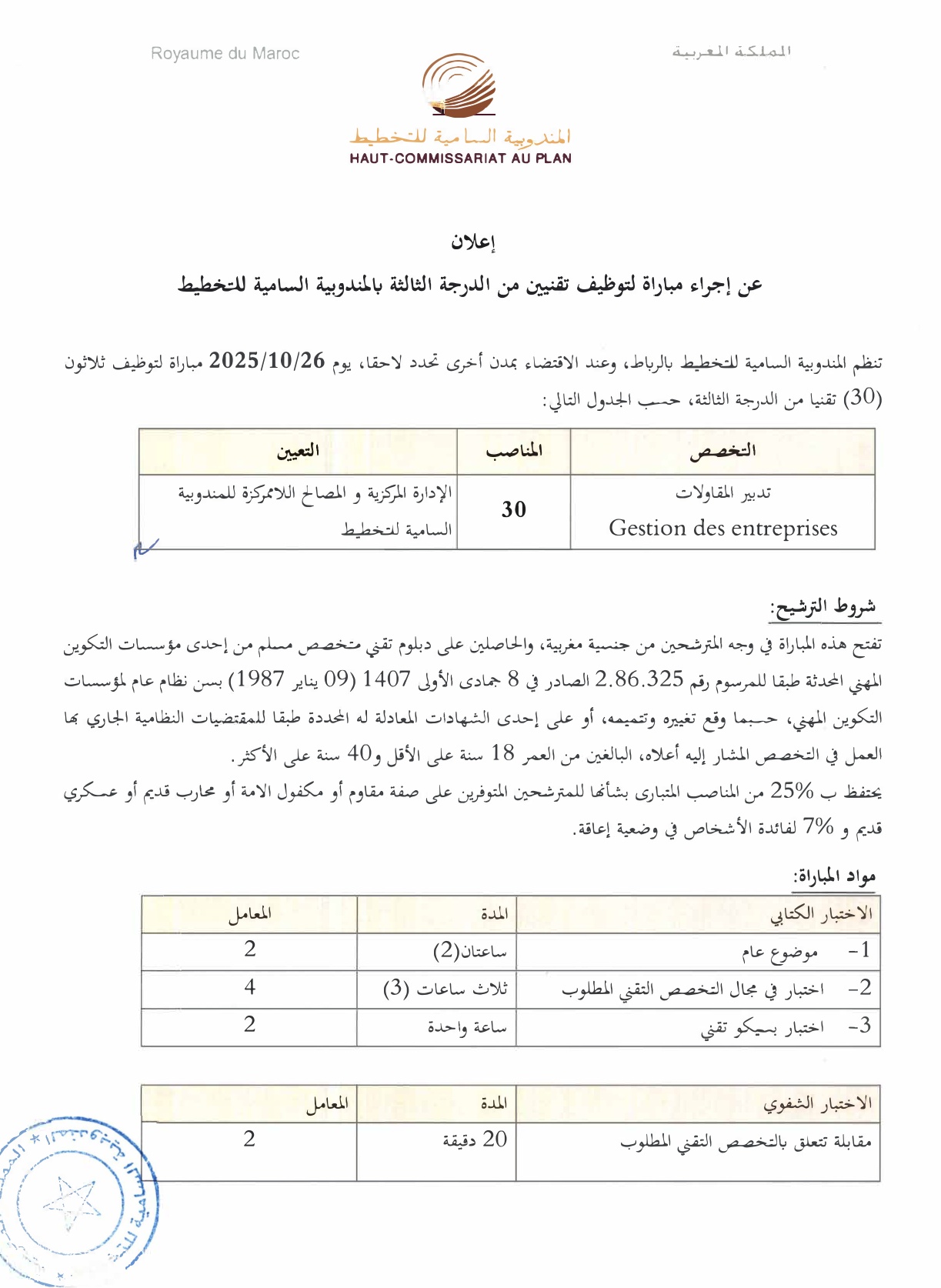 تعلن المندوبية السامية للتخطيط بالرباط، وعند الاقتضاء بمدن أخرى تُحدد لاحقاً، عن تنظيم مباراتين للتوظيف برسم سنة 2025: مباراة لتوظيف مهندسي الدولة من الدرجة الأولى، ومباراة لتوظيف تقنيين من الدرجة الثالثة.