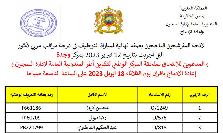 والمدعوين للالتحاق بملحقة المركز الوطني لتكوين أطر المندوبية العامة لادارة السجون وإعادة الإدماج بافران يوم الثلاثاء 18 أبريل 2023 على الساعة التاسعة صباحا.