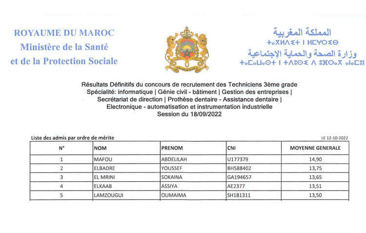 النتائج النهائية لمباراة توظيف 70 تقني من الدرجة الثالثة بوزارة الصحة والحماية الاجتماعية – دورة 18 شتنبر 2022