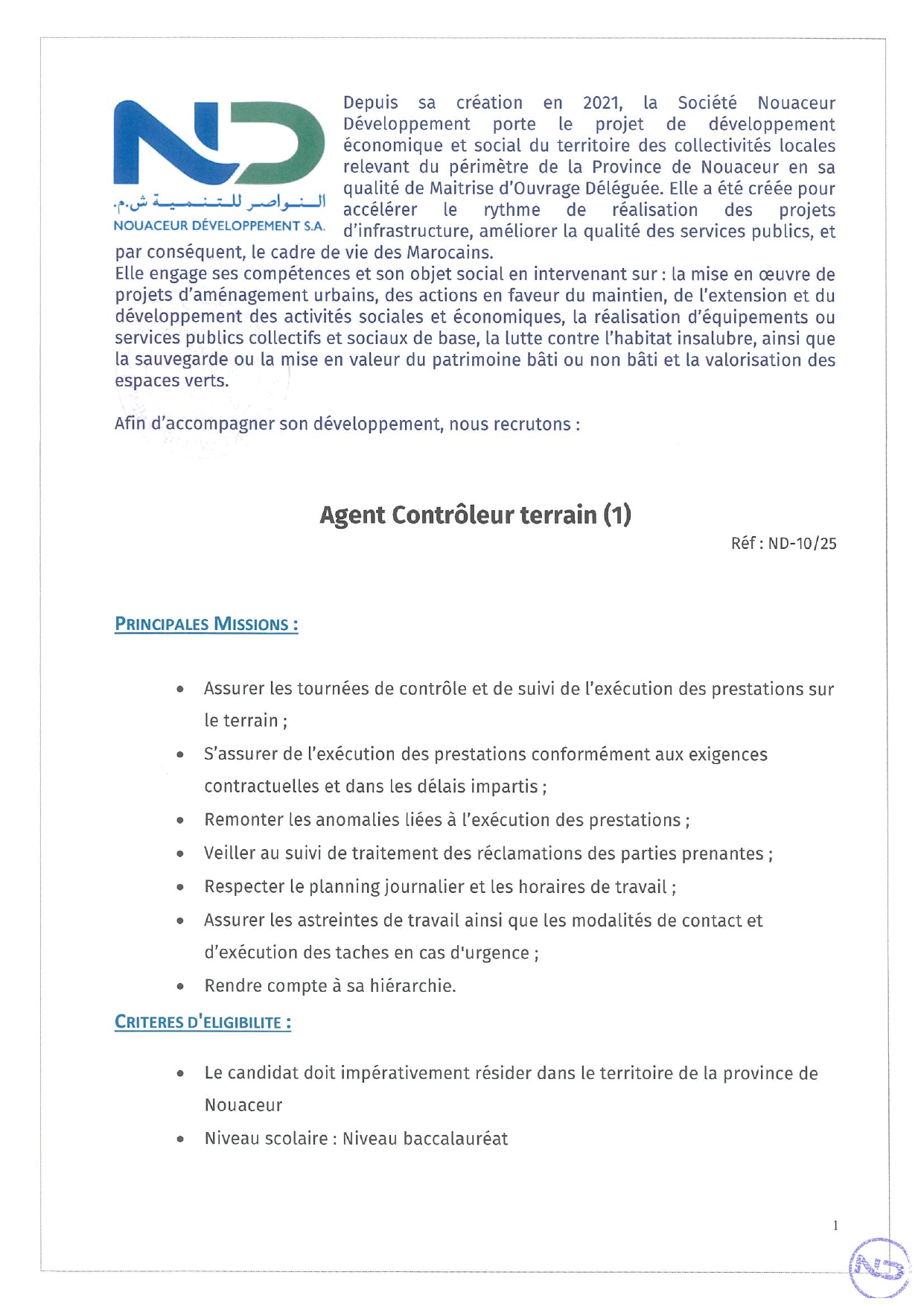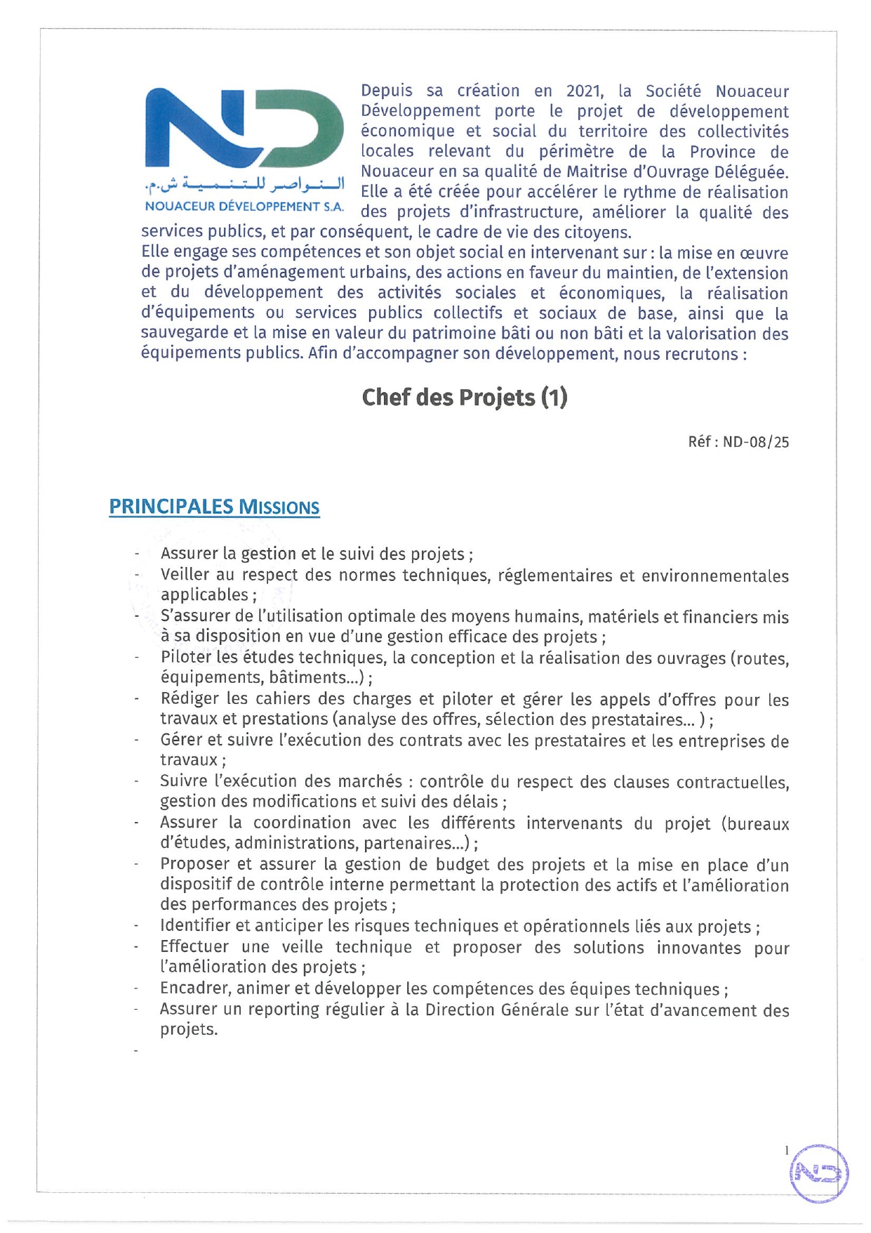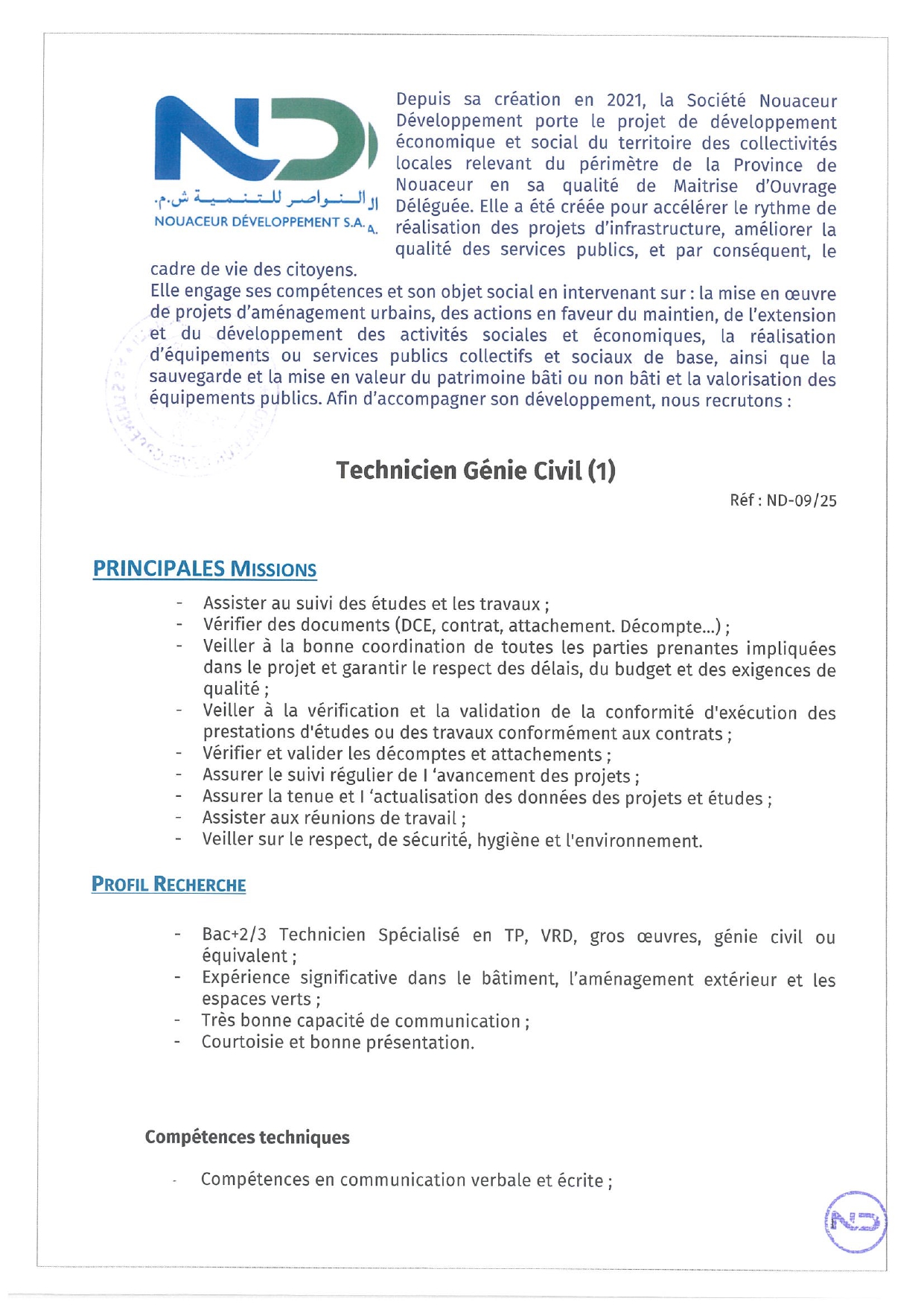 تنظم النواصر للتنمية ش.م Nouaceur Développement S.A مباريات للتوظيف من أجل شغل 6 مناصب موزعة كالتالي: