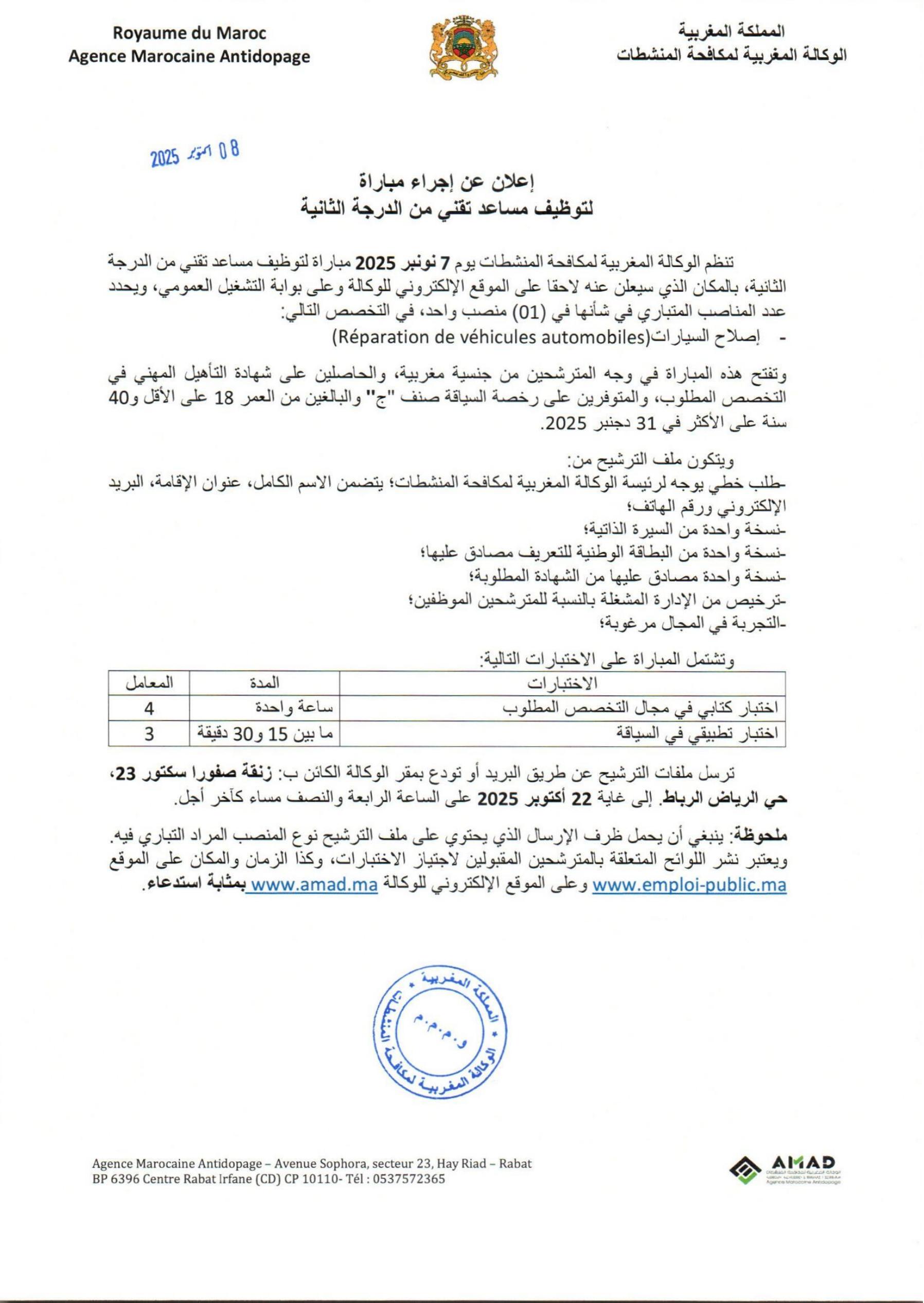 L’Agence Marocaine Antidopage (AMAD) annonce l’ouverture de plusieurs concours pour le recrutement de différents profils. Les candidats intéressés sont invités à soumettre leur dossier au plus tard le 22 octobre 2025 à 16h30.