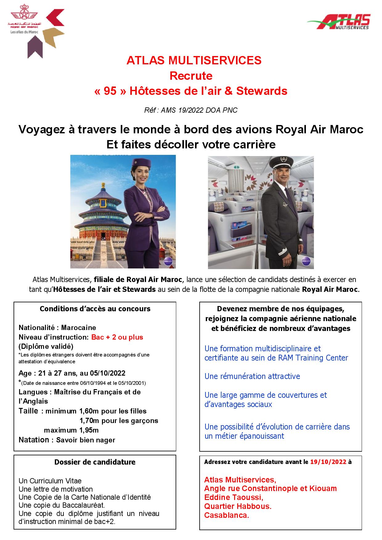 Atlas Multiservices, filiale de Royal Air Maroc, lance une sélection de candidats destinés à exercer en tant qu’Hôtesses de l’air et Stewards au sein de la flotte de la compagnie nationale Royal Air Maroc.