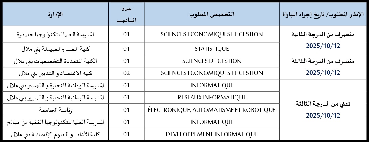 تعلن جامعة السلطان مولاي سليمان ببني ملال عن إجراء مباريات توظيف في المناصب العمومية وفق الجدول التالي: