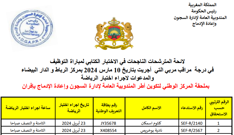 لائحة المترشحات الناجحات في الاختبار الكتابي و المدعوات لإجراء اختبار الرياضة لمباراة توظيف 40 مراقب مربي اناث بالمندوبية العامة لإدارة السجون وإعادة الإدماج 2024.