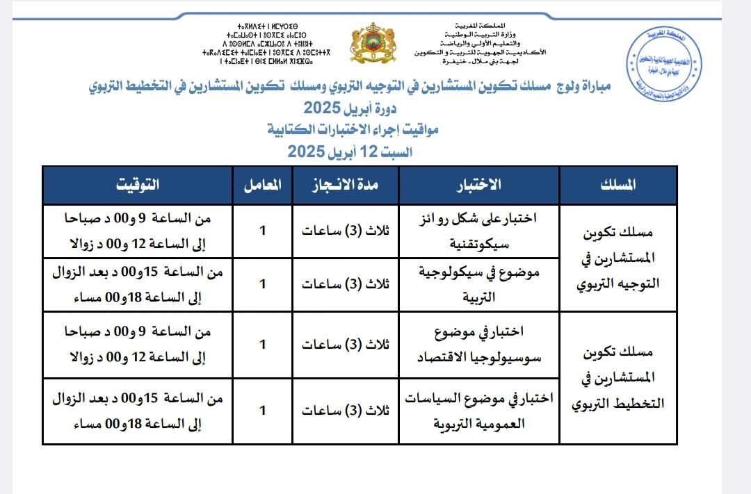 تعلن وزارة التربية الوطنية والتعليم الاولي والرياضة انها ستنظم يوم السبت 12 ابريل 2025 مباراة ولوج مسلك تكوين المستشارين في التوجيه التربوي ومسلك تكوين المستشارين في التخطيط التربوي 2025.