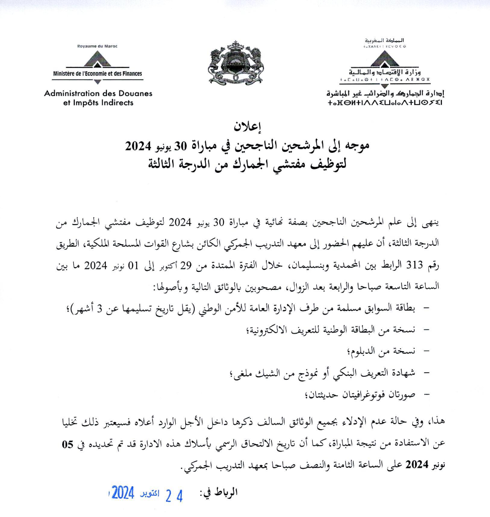 لائحة الناجحين في مباراة توظيف 67 مفتش الجمارك من الدرجة الثالثة بوزارة الاقتصاد والمالية 2024