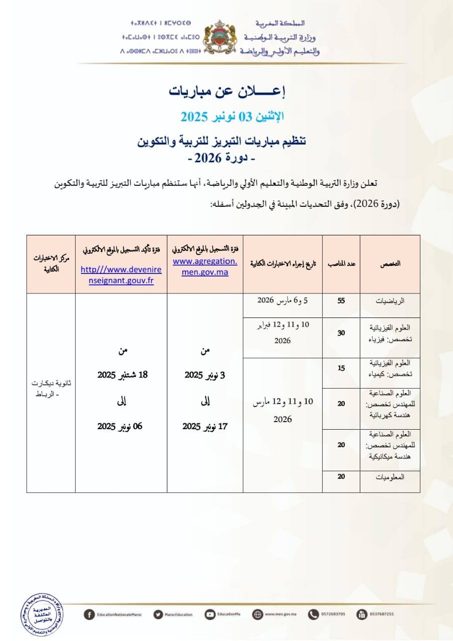 تُعلن وزارة التربية الوطنية والتعليم الأولي والرياضة عن تنظيم مباريات التبريز للتربية والتكوين – دورة 2026، لفائدة المترشحين الراغبين في ولوج مسالك التكوين بمراكز إعداد هيئات التدريس والتكوين، وذلك في عدد من التخصصات العلمية والأدبية.