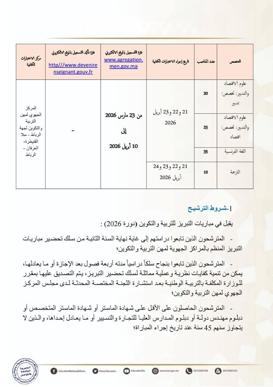 يمكن للمترشحين الراغبين في اجتياز المباراة التسجيل عبر البوابة الإلكترونية www.agregation.men.gov.ma، وذلك خلال الفترة الممتدة من 3 إلى 17 نونبر 2025، بالنسبة للتخصصات العلمية، ومن 23 مارس إلى 10 أبريل 2026 بالنسبة للتخصصات الاقتصادية والأدبية.