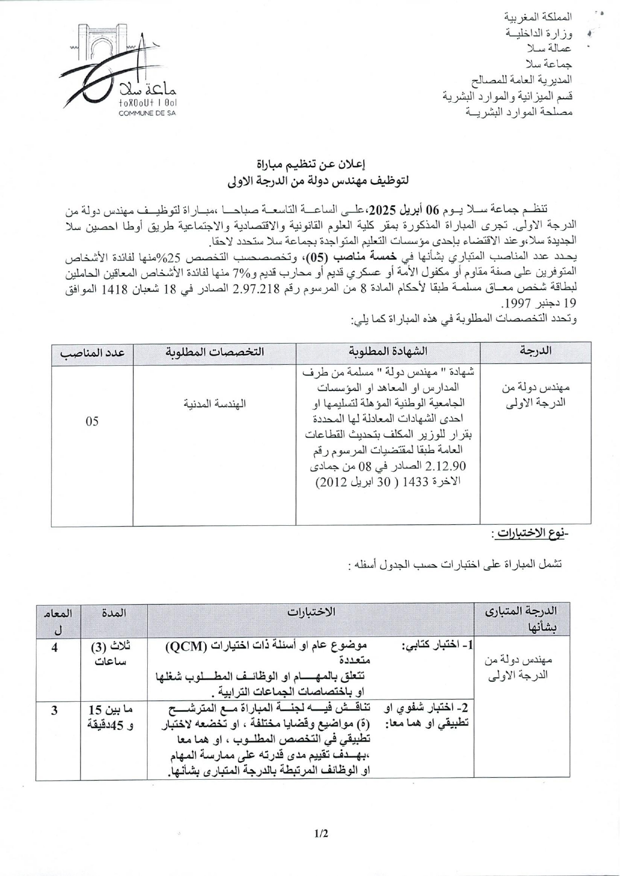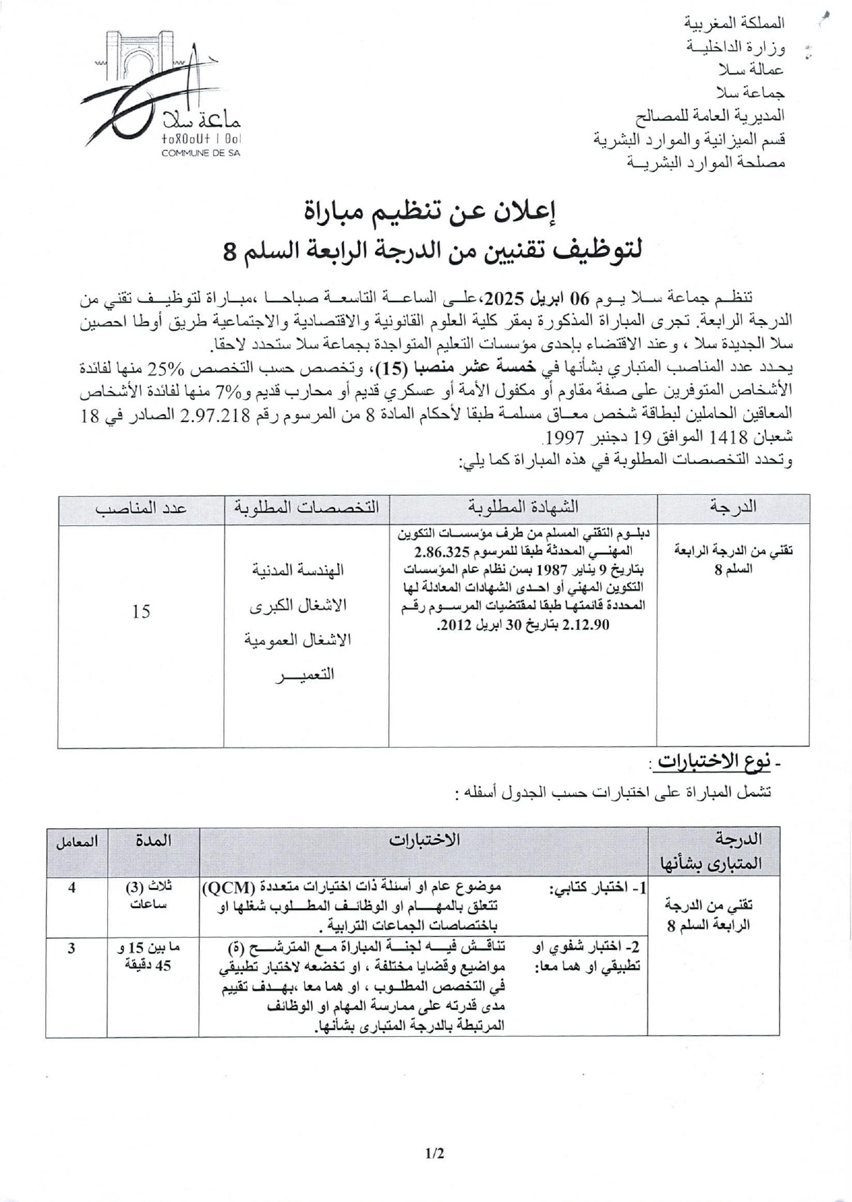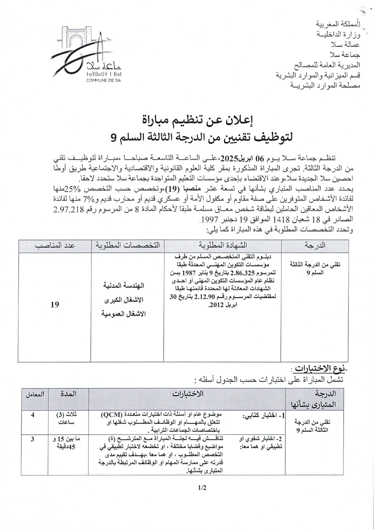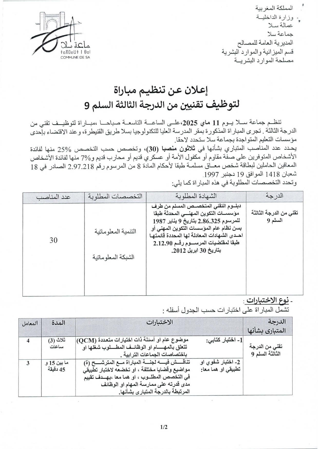 جماعة سلا: مباريات لتوظيف 95 منصبا في عدة تخصصات ودرجات. آخر أجل هو 17 مارس 2025