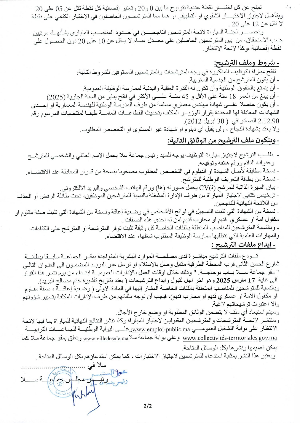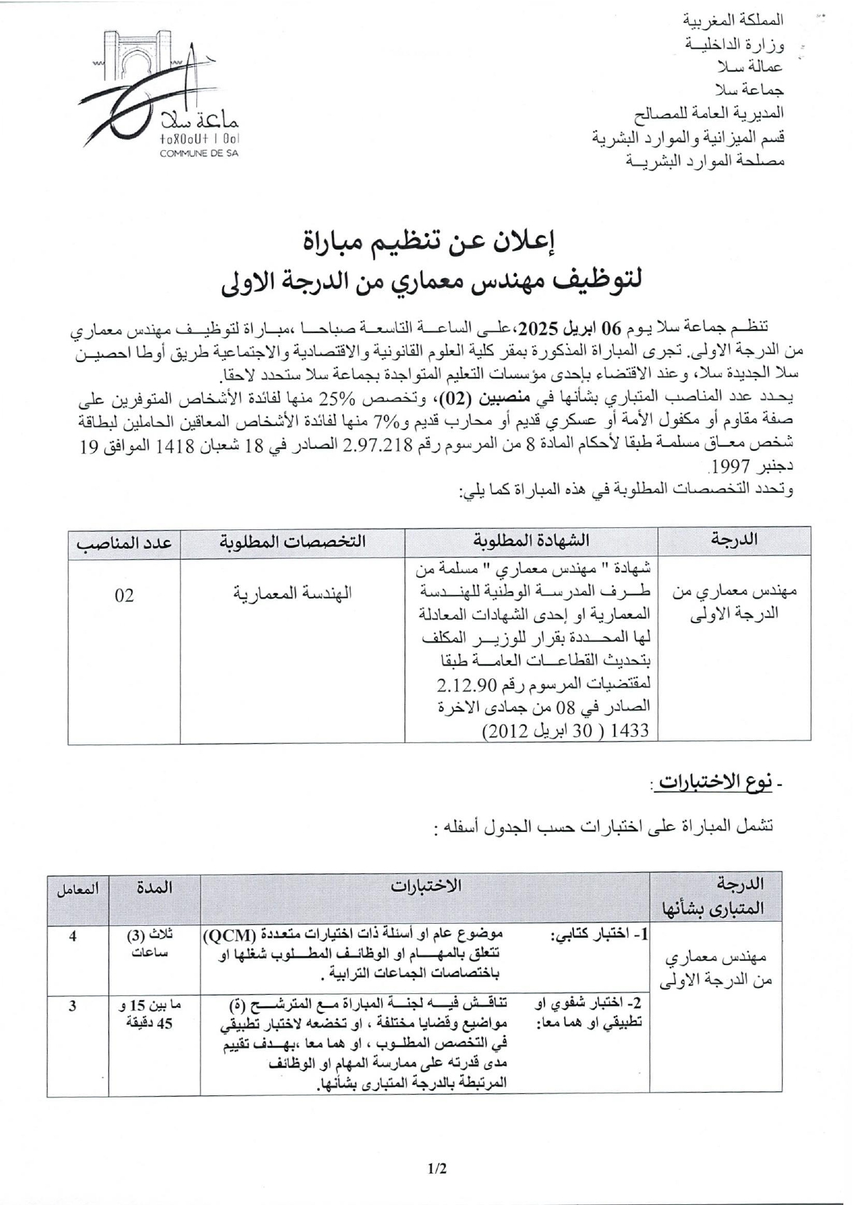 إعلان لمباراة توظيف (2) مهندس معماري من الدرجة الأولى
