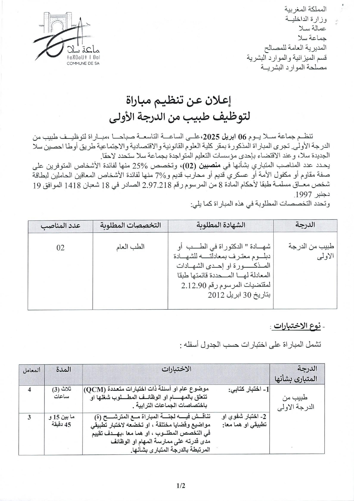 إعلان لمباراة توظيف (2) طبيب من الدرجة الأولى