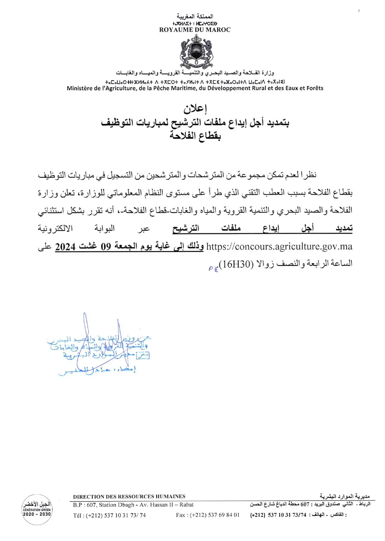 إعلان بتمديد أجل إيداع مفلات الترشيح لمباريات التوظيف بقطاع الفلاحة 2024
