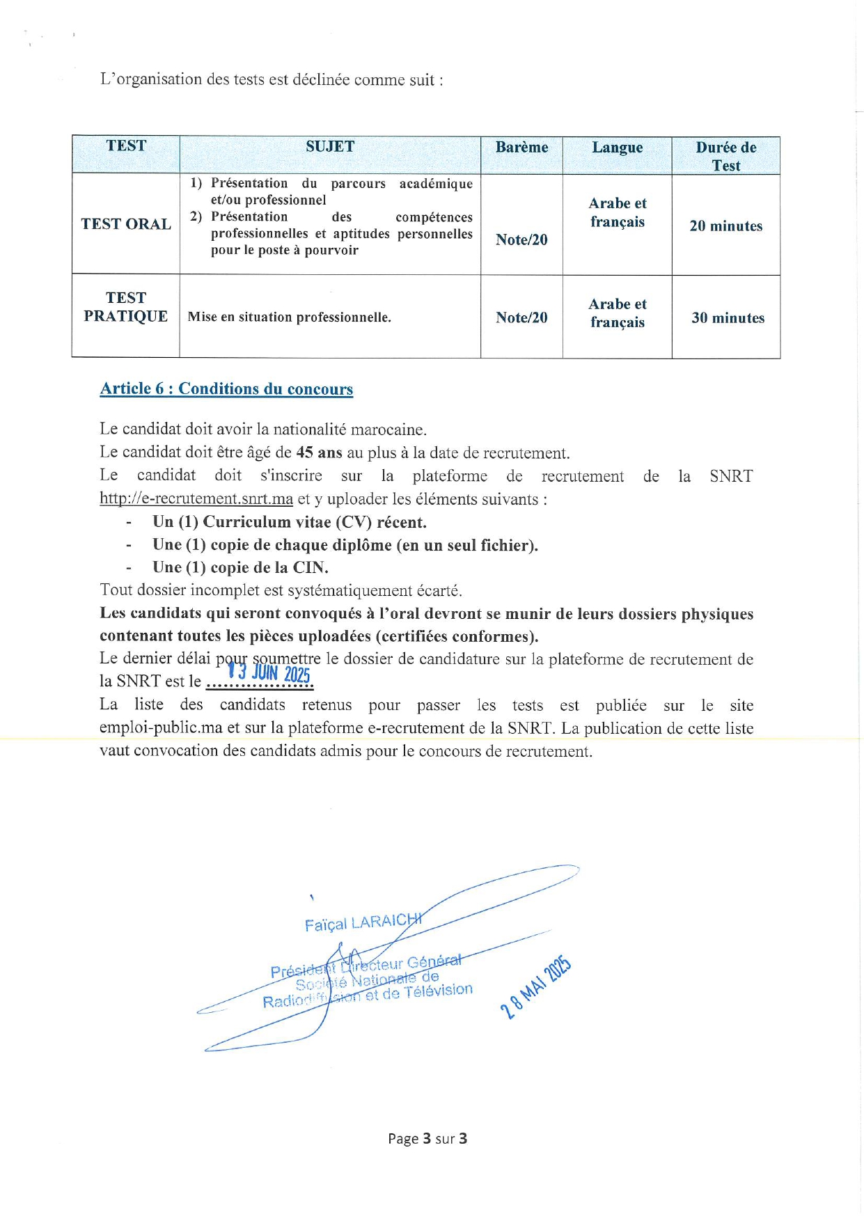 Les candidats doivent s’inscrire sur la plateforme e-recrutement SNRT avant le 13/06/2025 et soumettre les documents suivants: