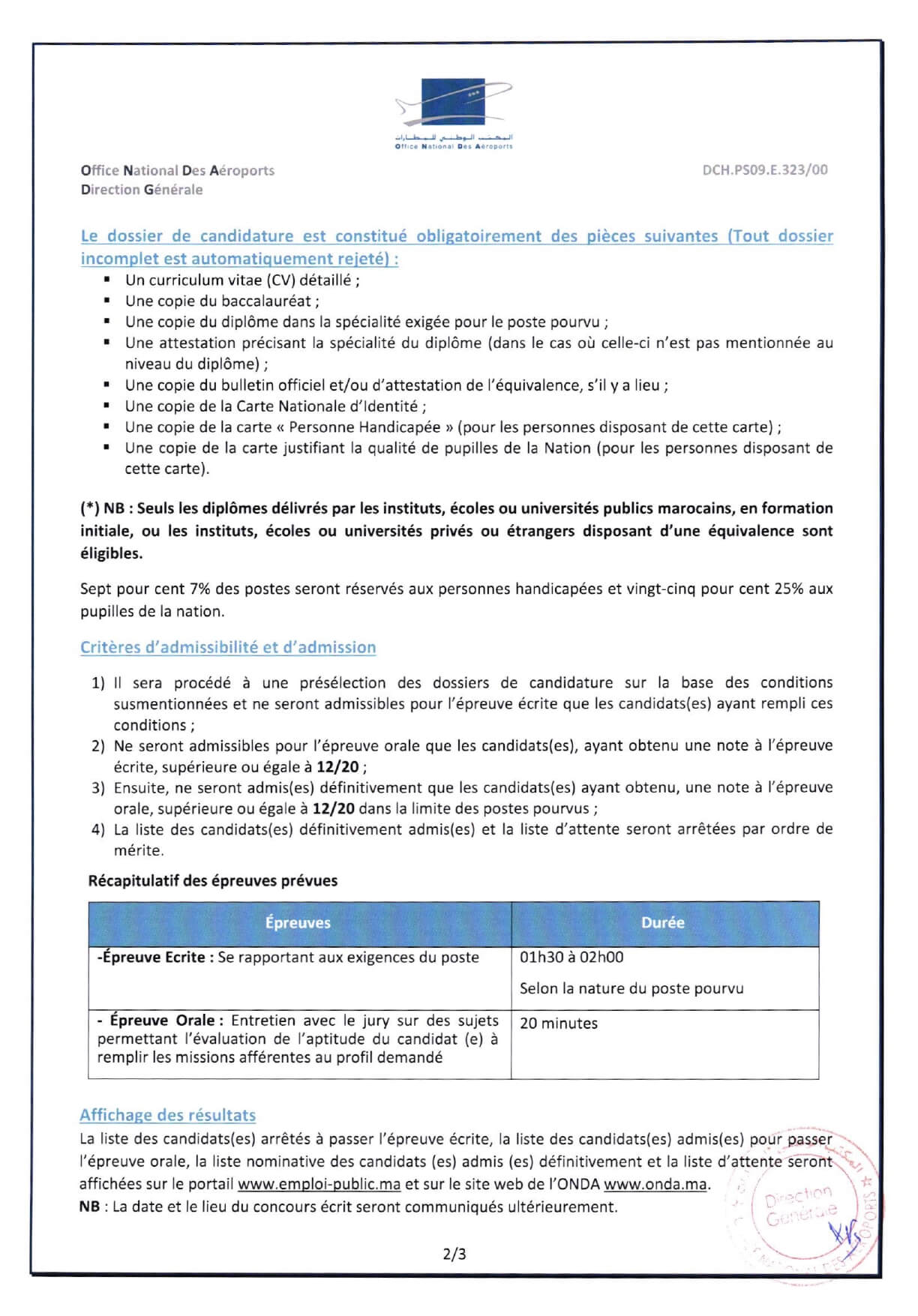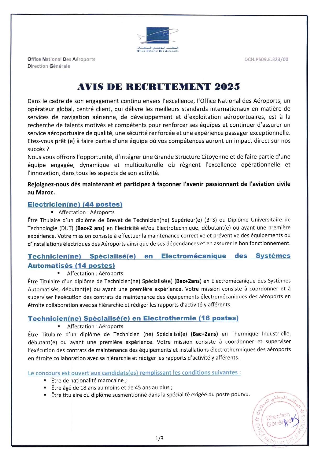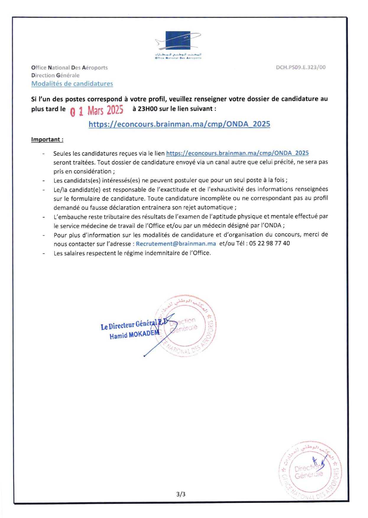 - التوظيف النهائي مشروط باجتياز الفحص الطبي الذي يجريه قسم الطب المهني بالمكتب الوطني للمطارات.