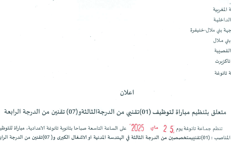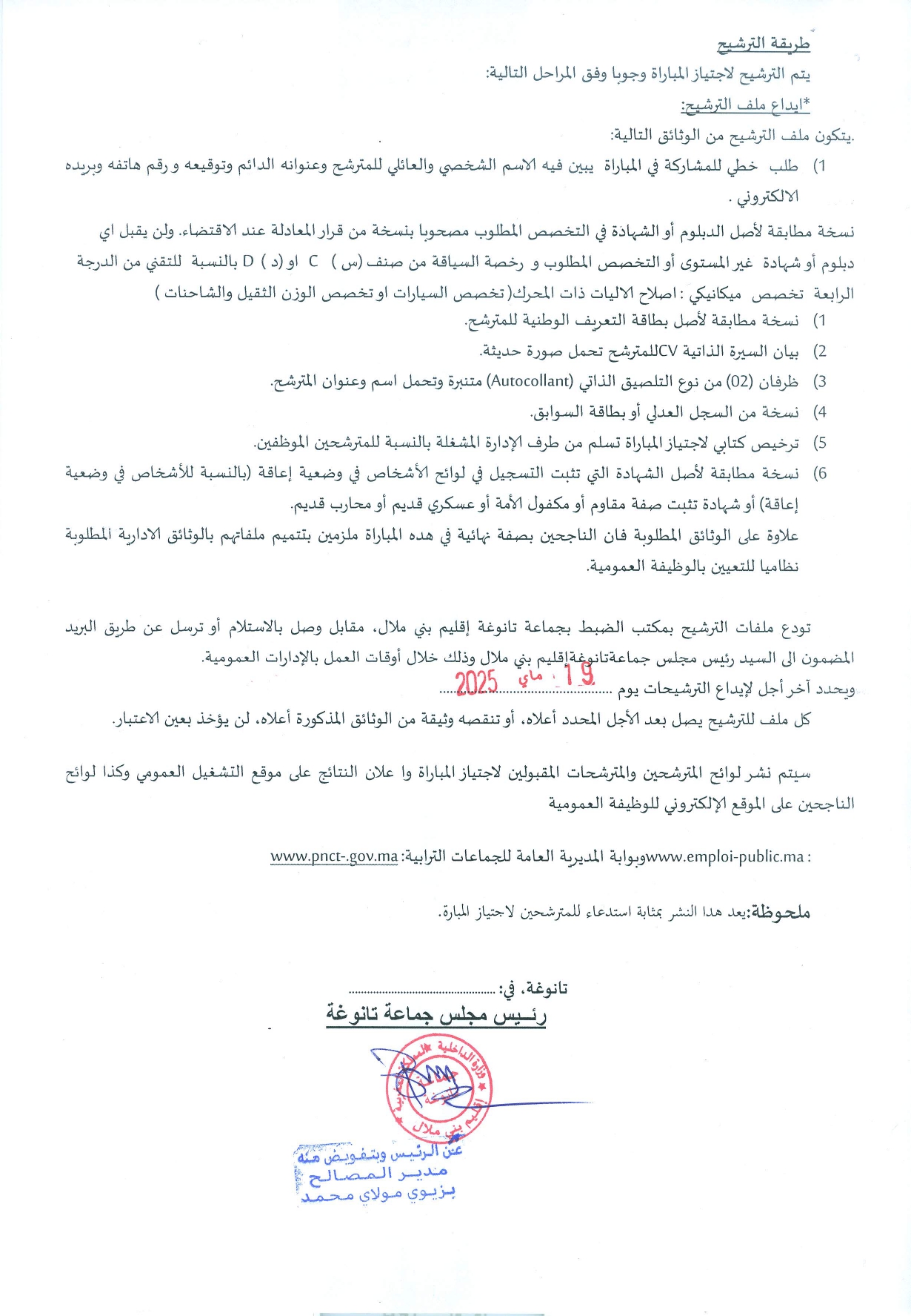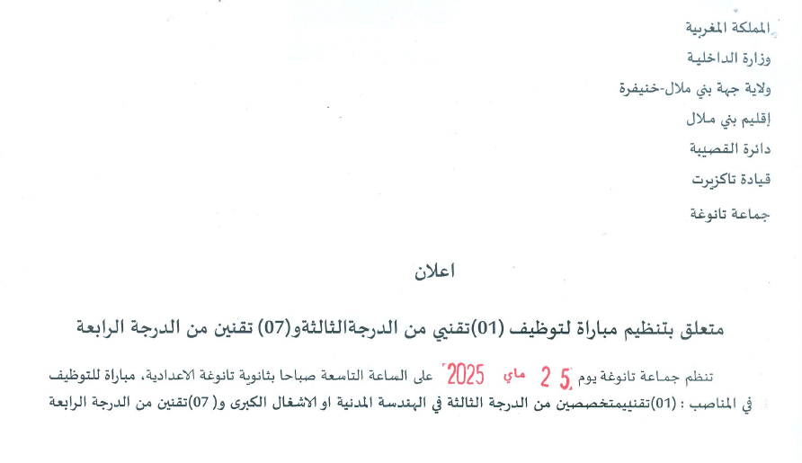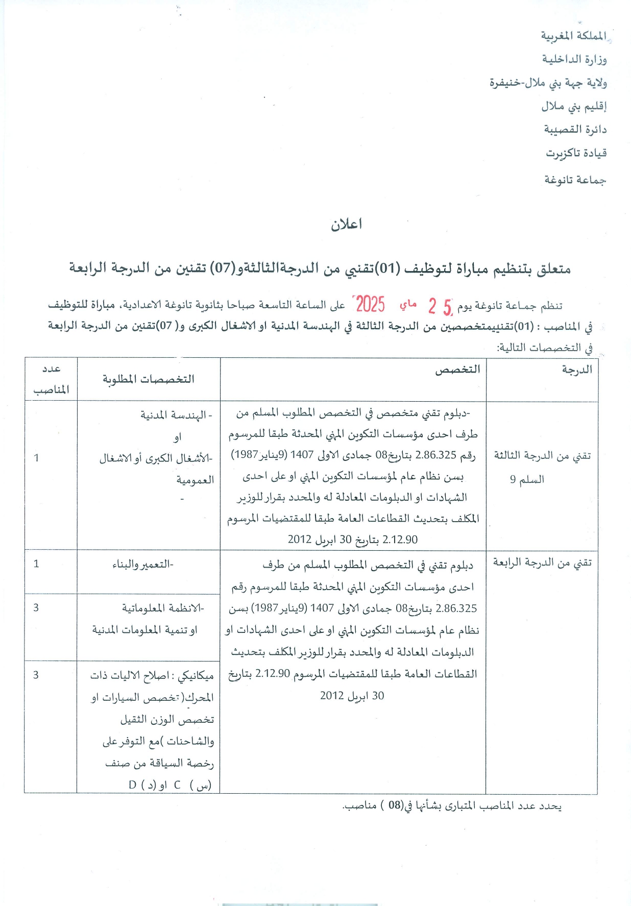 جماعة تانوغة إقليم بني ملال الإعلان عن مباراة توظيف 8 مناصب آخر أجل 19 ماي 2025