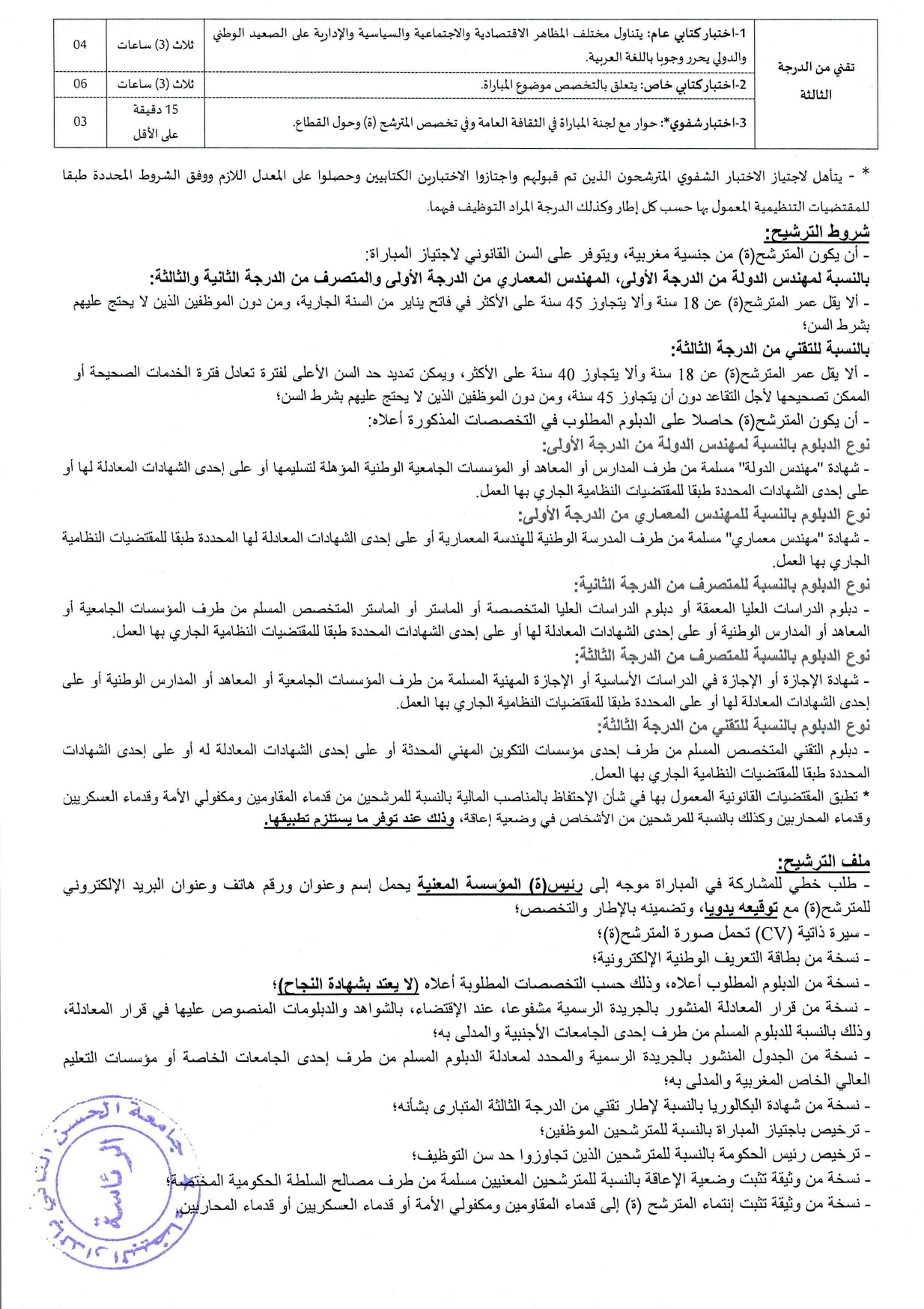 الاسم، النسب، العنوان، رقم الهاتف، البريد الإلكتروني، الإطار والتخصص المطلوب الترشح له؛ - السيرة الذاتية مع صورة حديثة؛