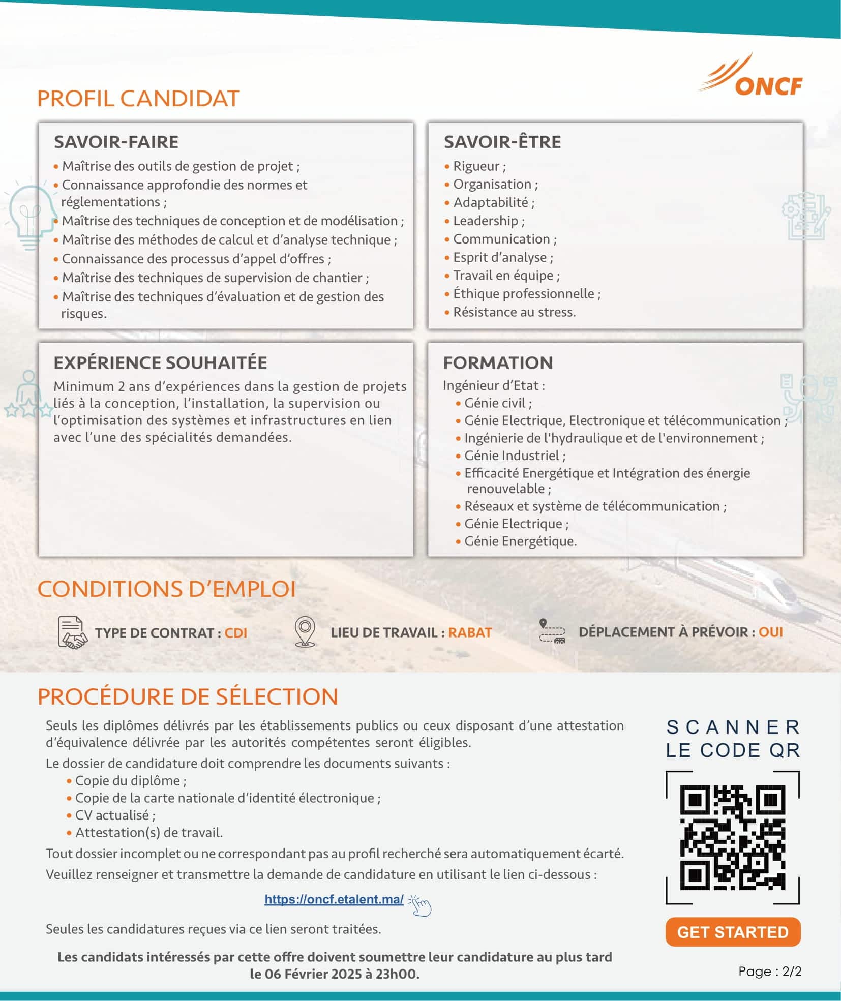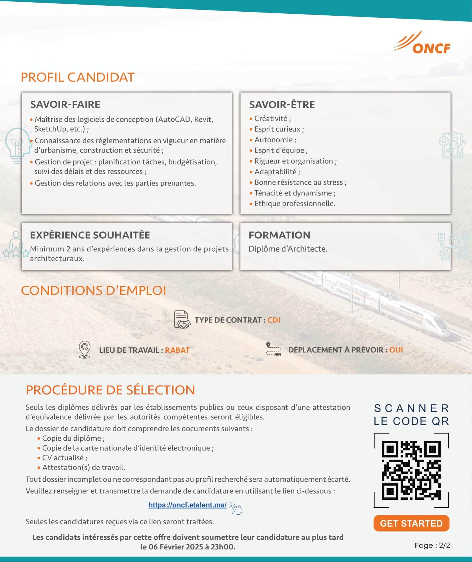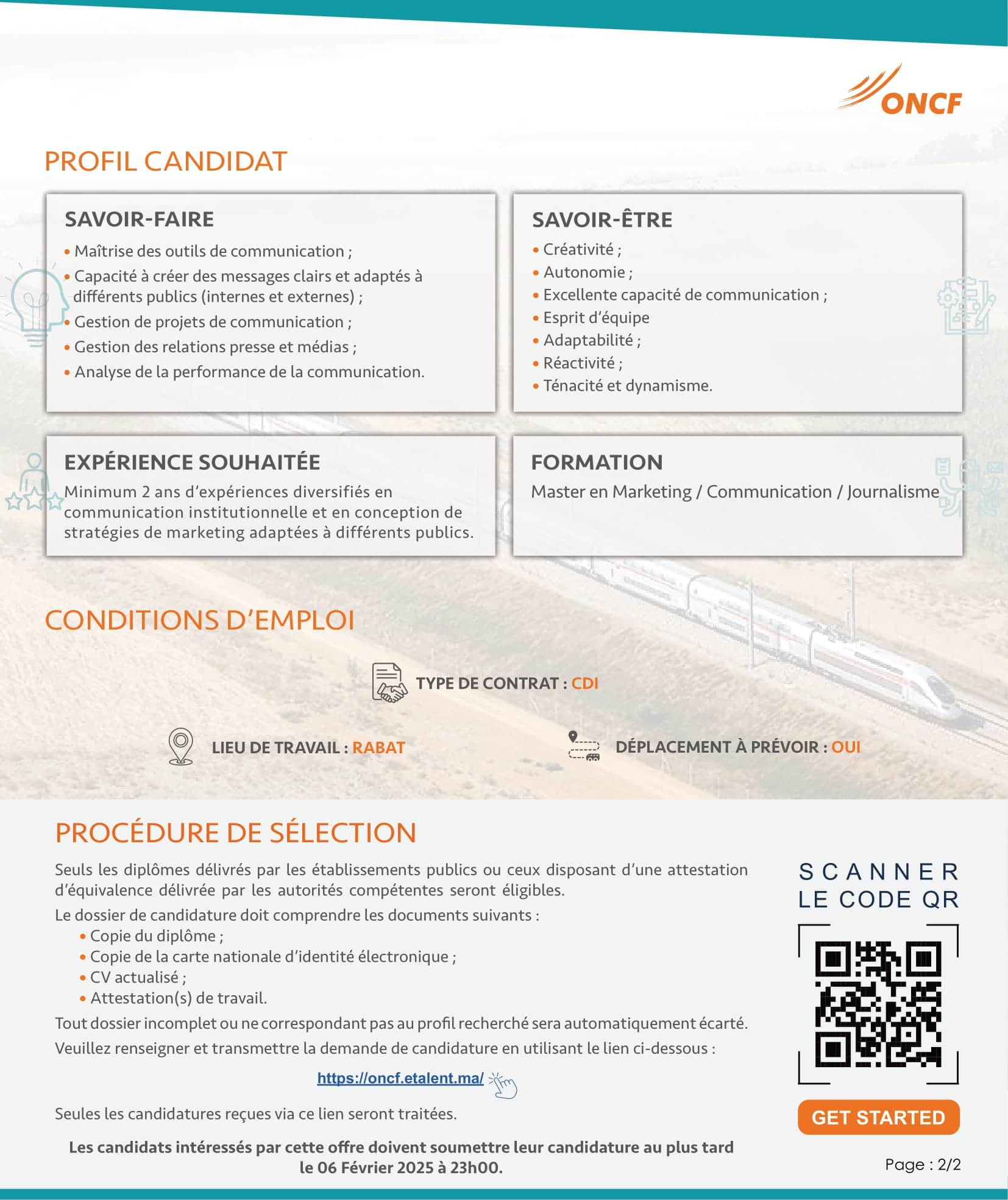 يُطلب من المهتمين تقديم طلباتهم عبر البوابة الإلكترونية https://oncf.etalent.ma قبل تاريخ 6 فبراير 2025 على الساعة 23:00. يجب أن يتضمن الملف:
