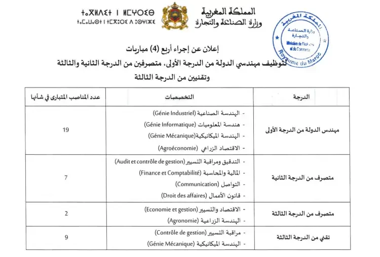 تنظم وزارة الصناعة والتجارة يوم 7 ماي 2023 بالرباط أو بمدن أخرى عند الاقتضاء، أربع (4) مباريات لتوظيف مهندسي الدولة من الدرجة الأولى ومتصرفين من الدرجة الثانية والثالثة وتقنيين من الدرجة الثالثة بمصالحها المركزية واللاممركزة وذلك حسب التخصصات التالية: