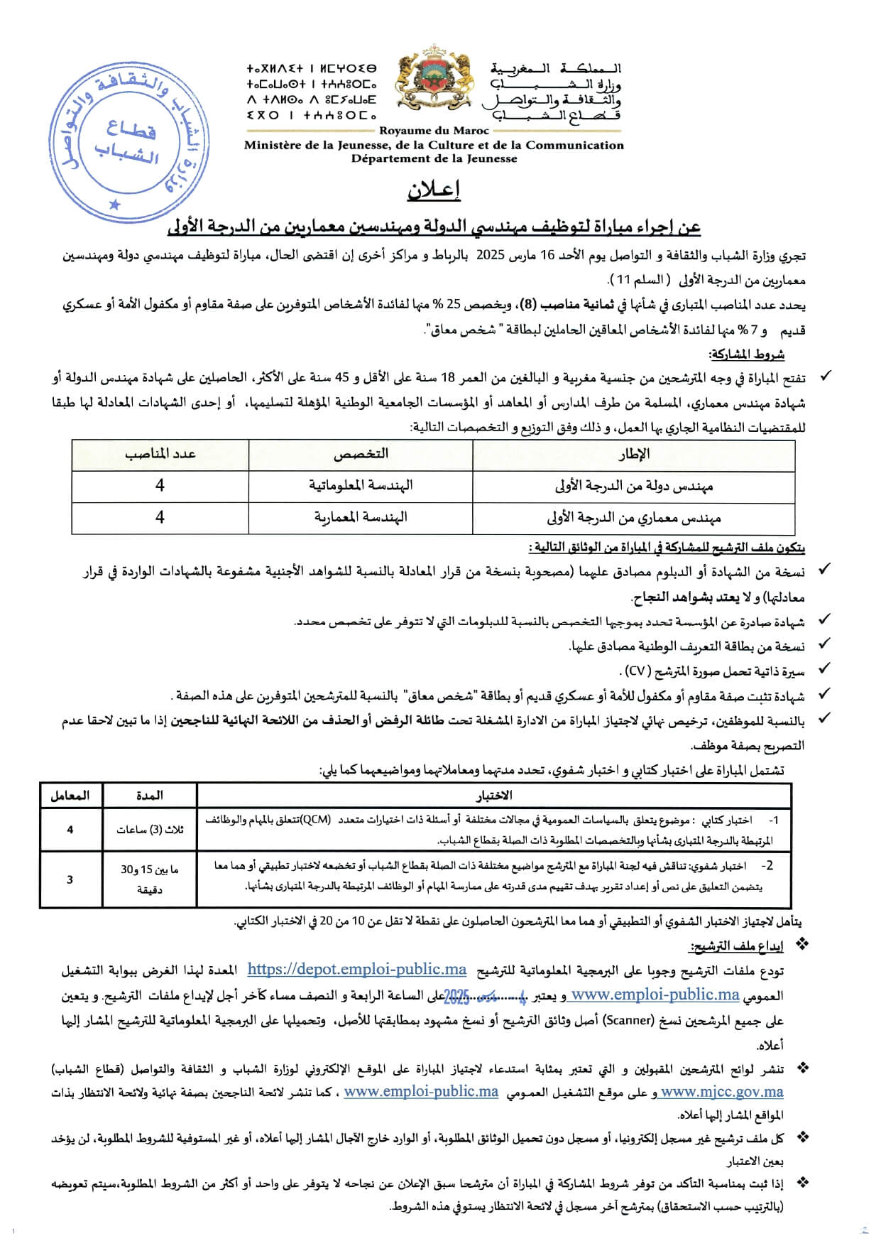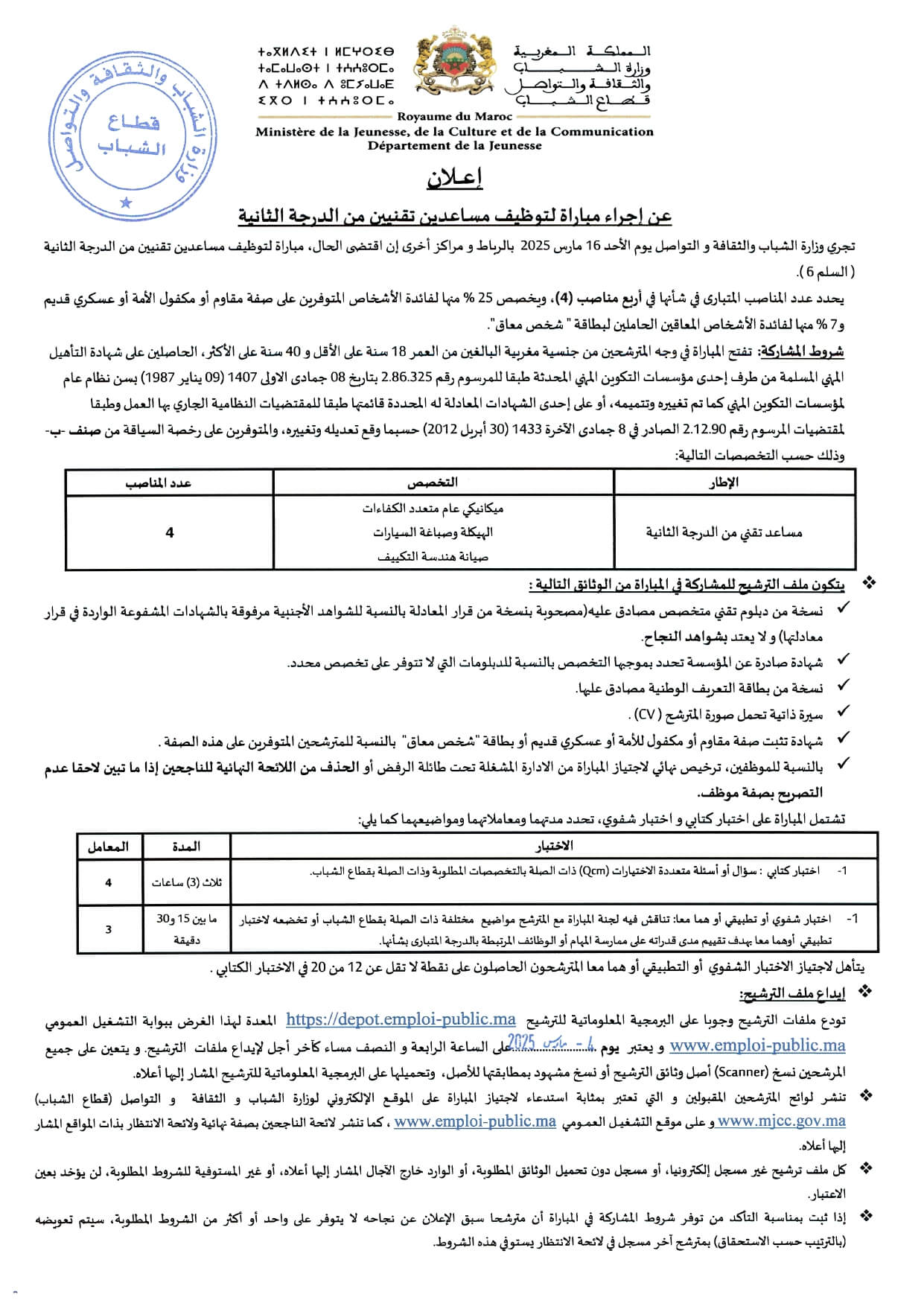 إعلان عن مباريات لتوظيف أطر ومساعدين تقنيين بوزارة الشباب والثقافة والتواصل برسم سنة 2025.