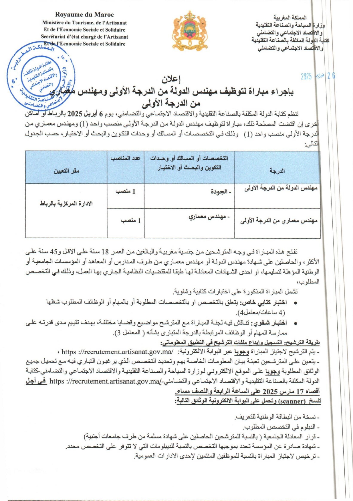 إعلان لمباراة توظيف (2) مهندس معماري من الدرجة الأولى بوزارة السياحة – قطاع الصناعة التقليدية 2025