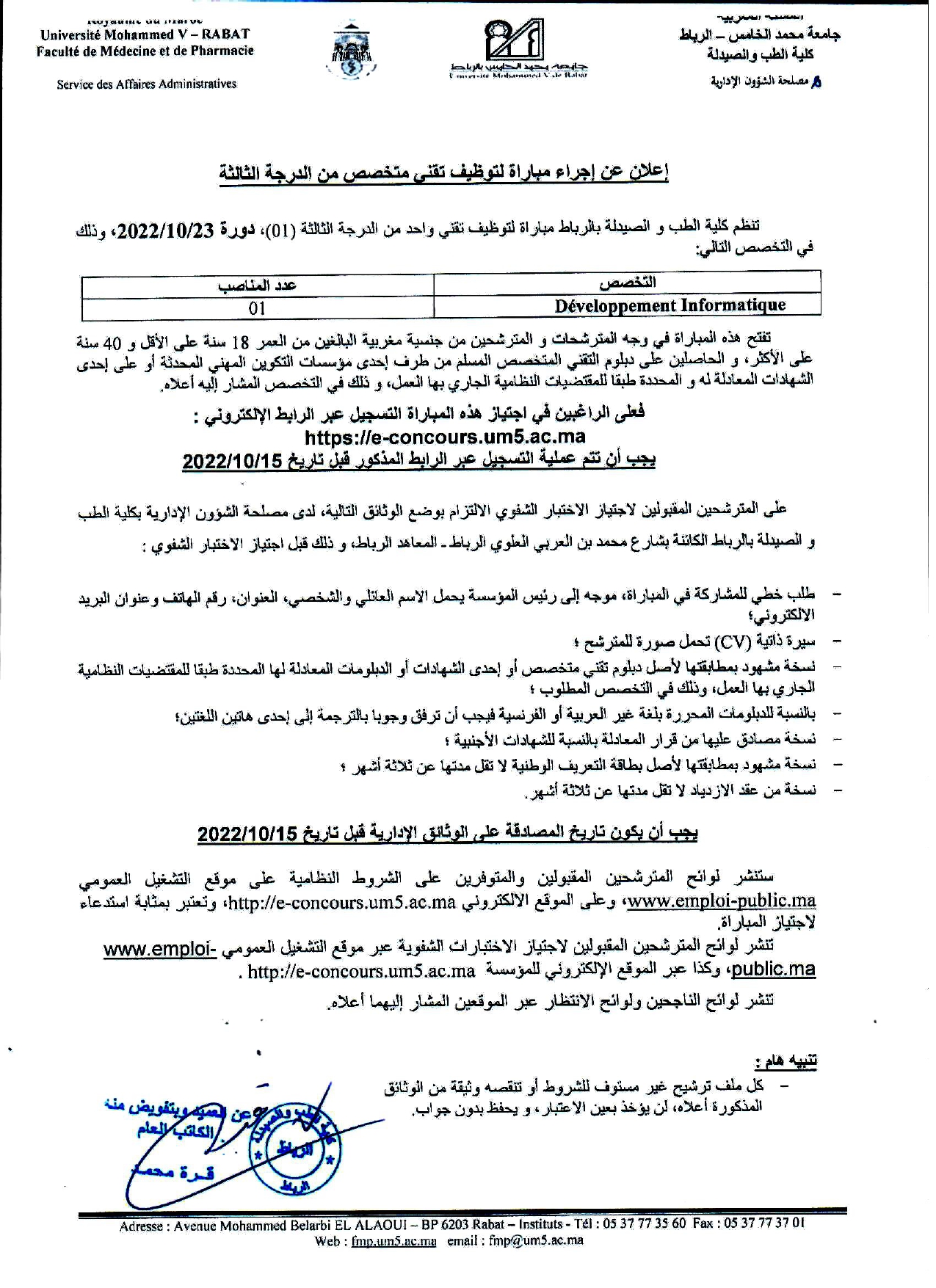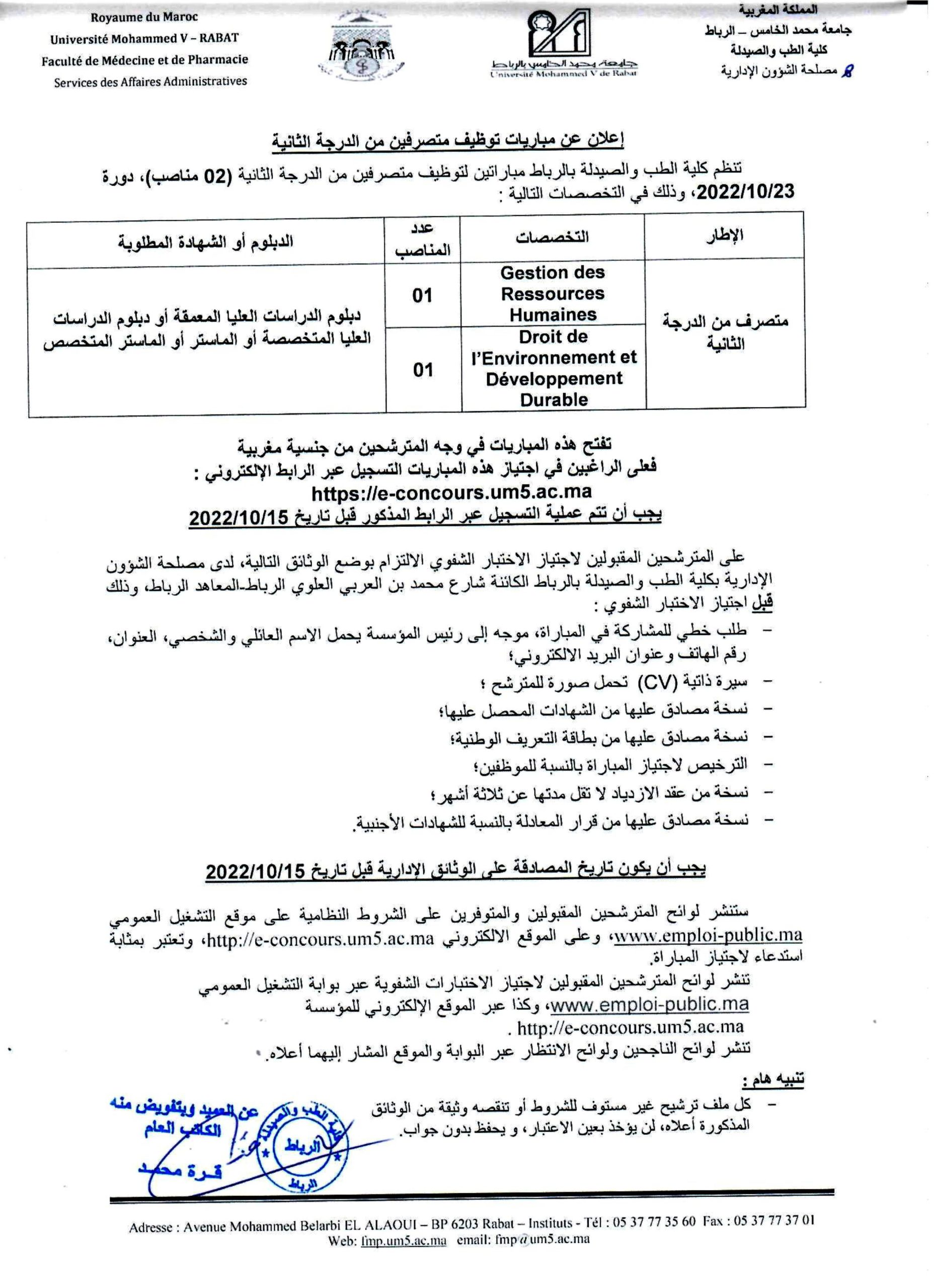تنظم كلية الطب والصيدلة بالرباط مباريات لتوظيف تقني من الدرجة الثالثة و 02 متصرفين من الدرجة الثانية دورة 23/10/2022.