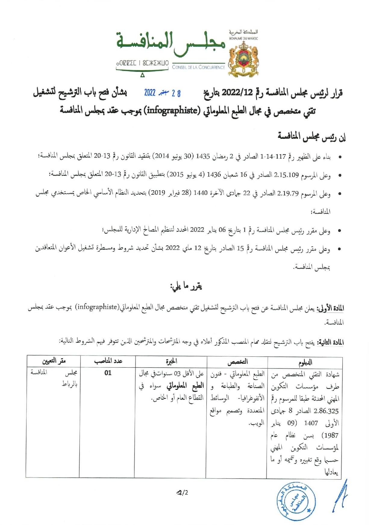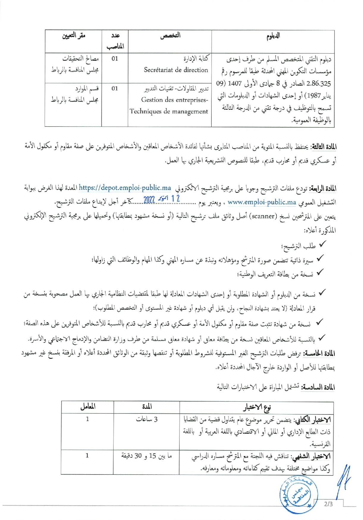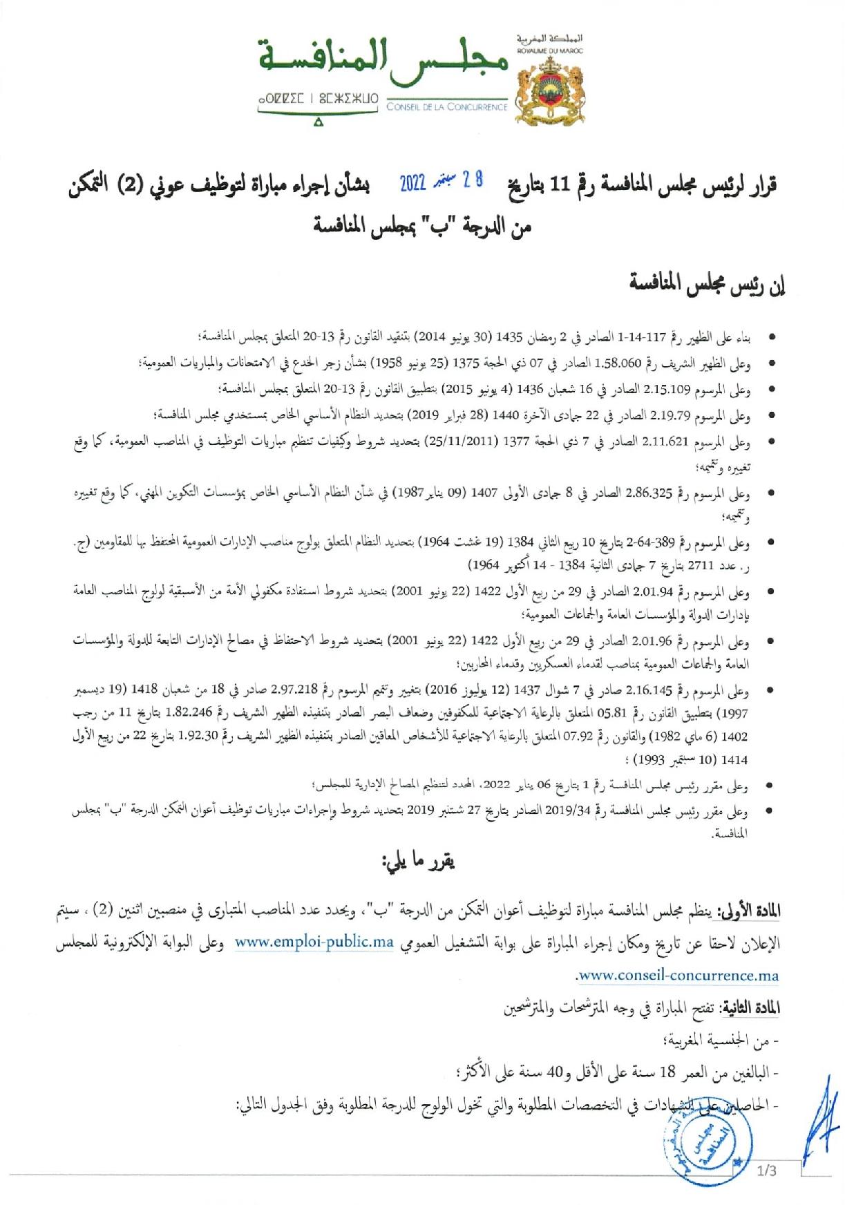 ينظم مجلس المنافسة مباراتي لتوظيف 3 تقنيين متخصصين في التخصصات التالية: