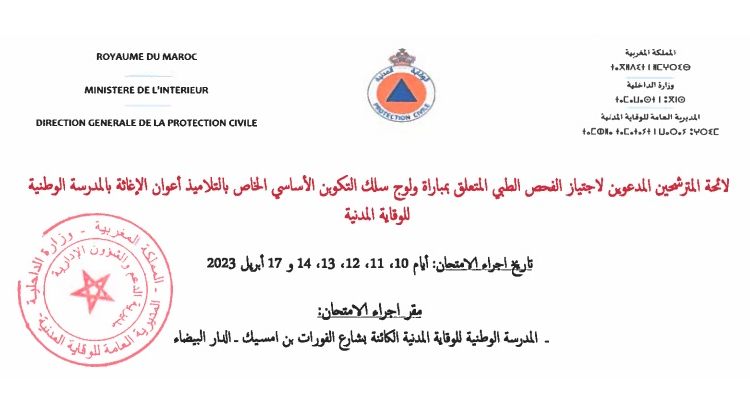 نتائج مباراة الوقاية المدنية 2023 توظيف أعوان الإغاثة 328 منصب: لائحة المترشحين المدعوين لاجتياز الفحص الطبي المتعلق بمباراة ولوج سلك التكوين الأساسي الخاص بالتلاميذ أعوان الإغاثة بالمدرسة الوطنية للوقاية المدنية أيام 10، 11، 12، 13، 14 و17 أبريل 2023.