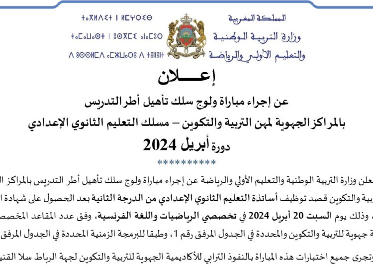 وزارة التربية الوطنية والتعليم الأولي والرياضة: مباراة توظيف 1593 أستاذ التعليم الثانوي الإعدادي يعتبر آخر أجل للترشيح هو 12 ابريل 2024.