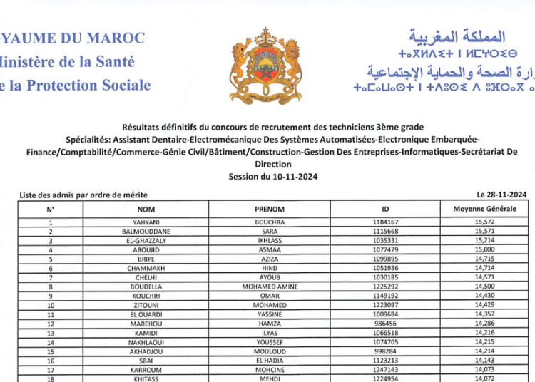 لائحة الناجحين في مباراة توظيف 230 تقني من الدرجة الثالثة بوزارة الصحة والحماية الاجتماعية 2024