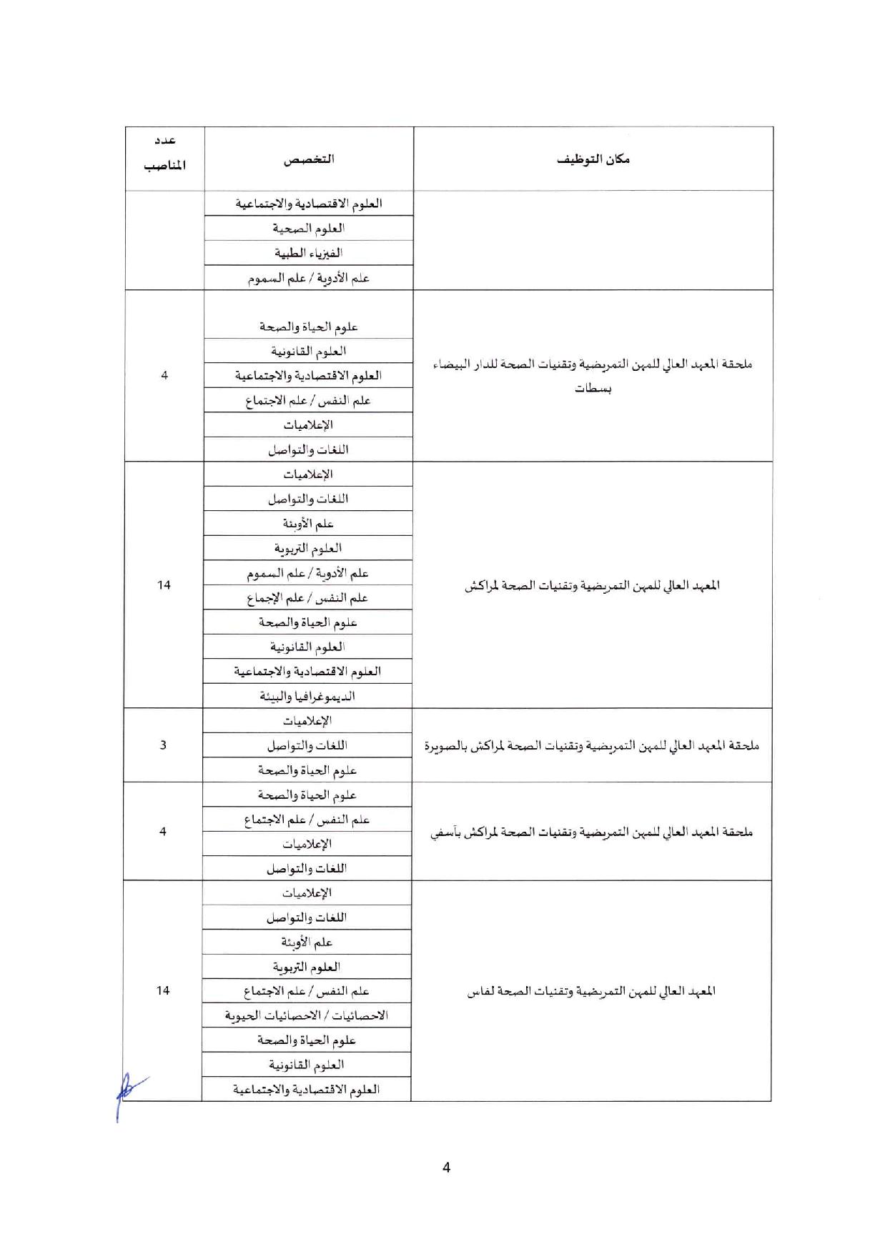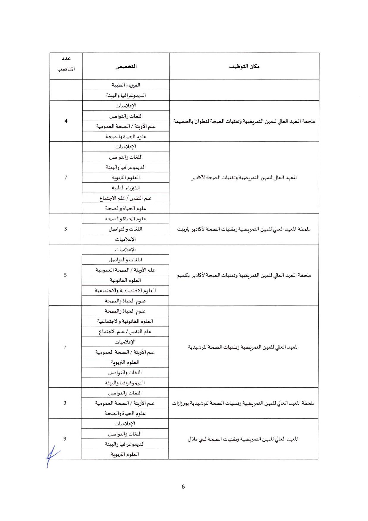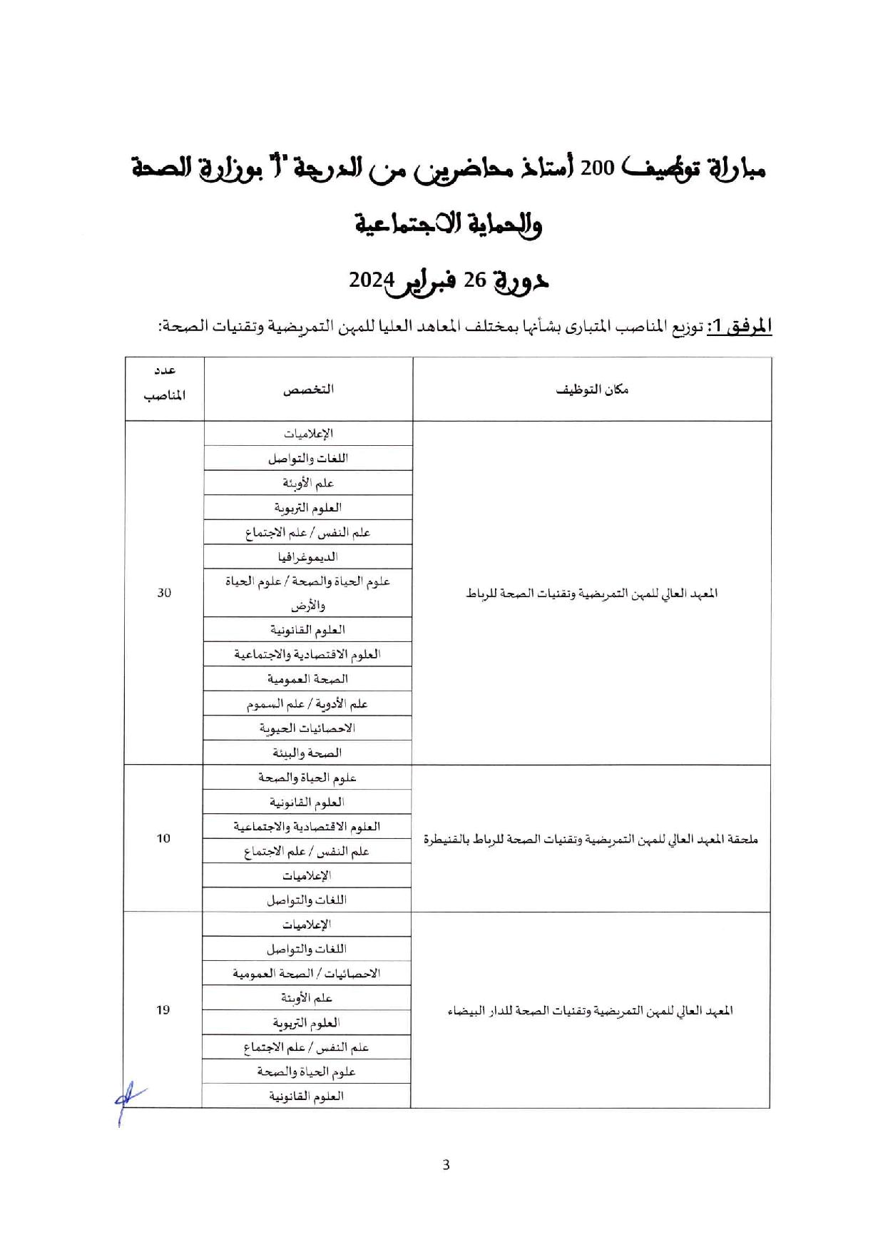 تنظم وزارة الصحة والحماية الاجتماعية ابتداء من 26 فبراير 2024 مباراة لتوظيف أساتذة محاضرين من الدرجة”أ”، ويحدد عدد المناصب المتباري بشأنها في 200 منصب، وتوزع هذه الأخيرة حسب الجدول رفقته (المرفق (1).