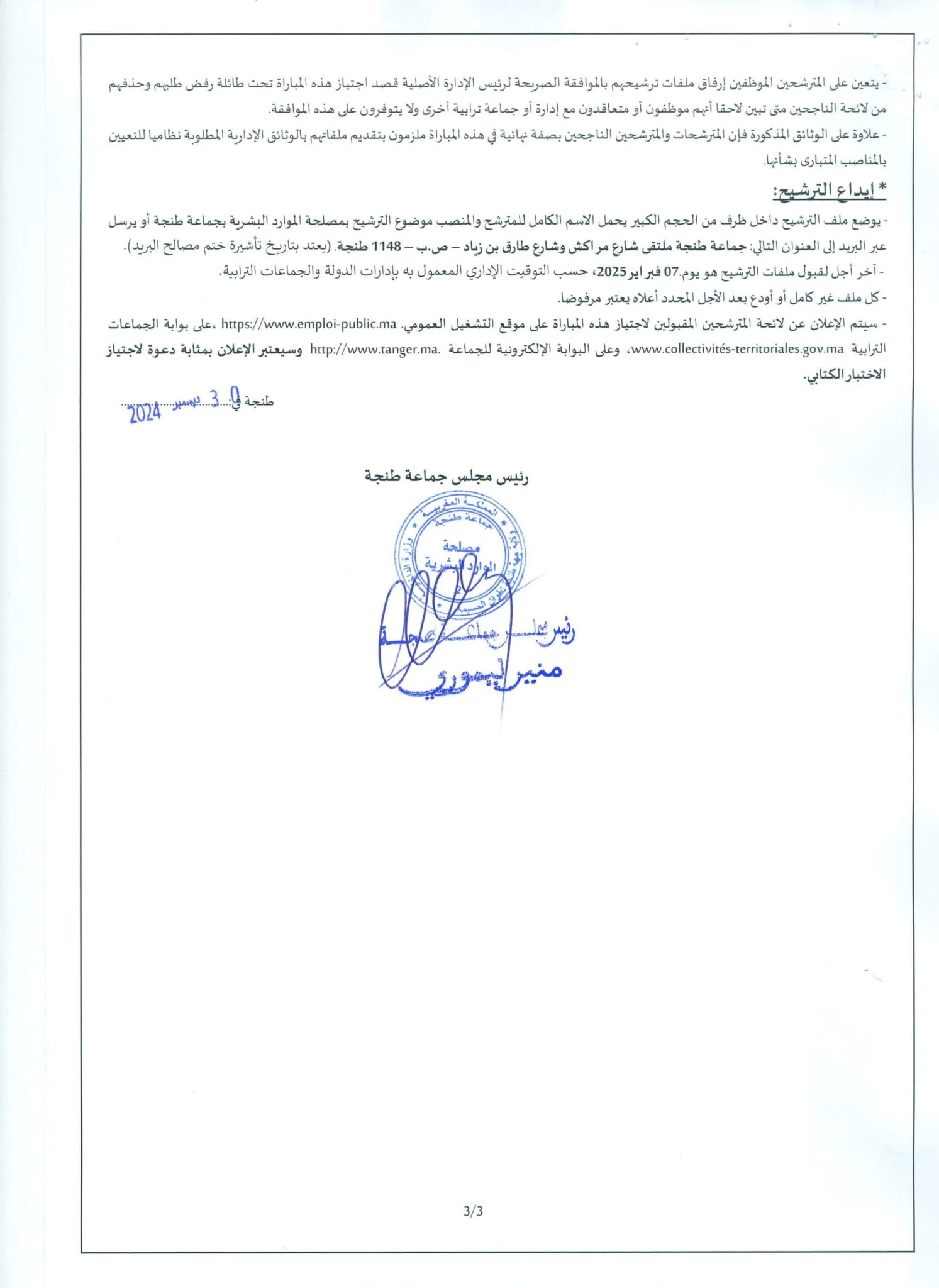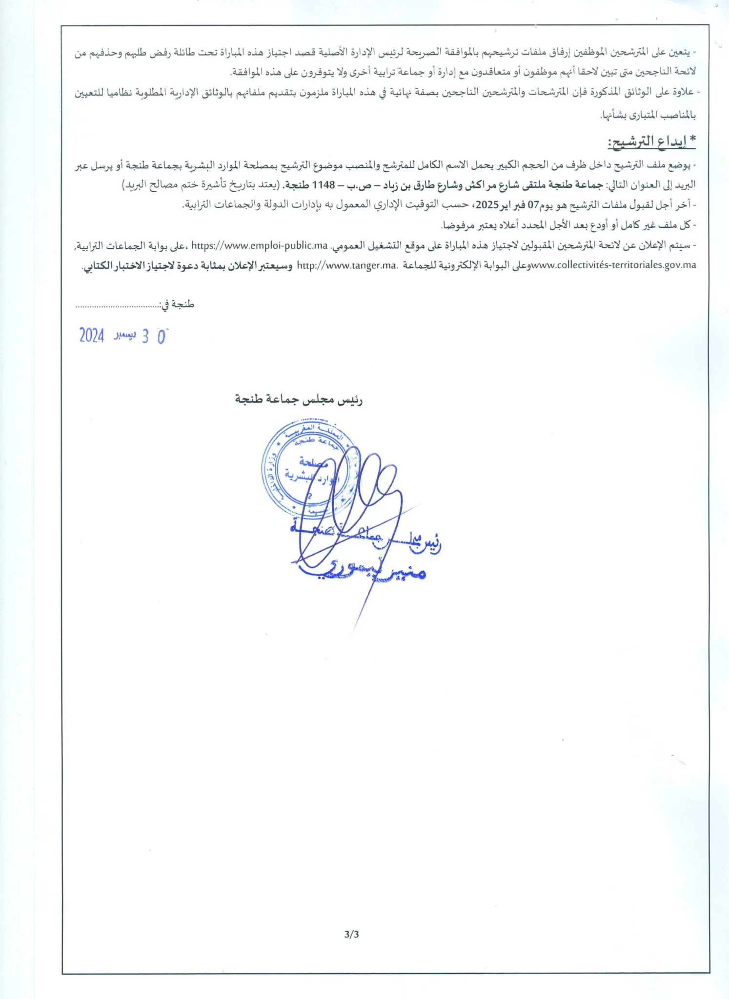 Les dossiers doivent être déposés auprès de la commune de Tanger ou envoyés par courrier recommandé à l’adresse indiquée dans l’annonce officielle. La date limite pour soumettre les candidatures est fixée au 7 février 2025.