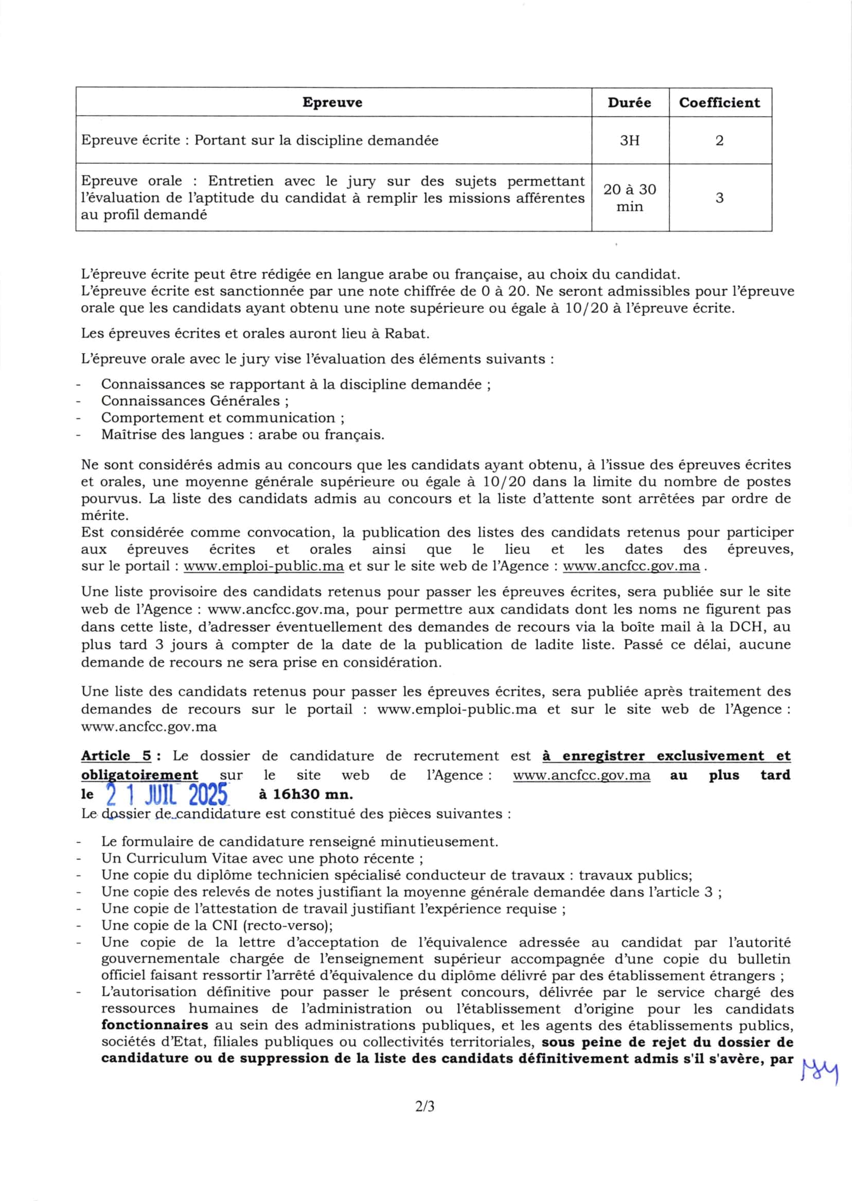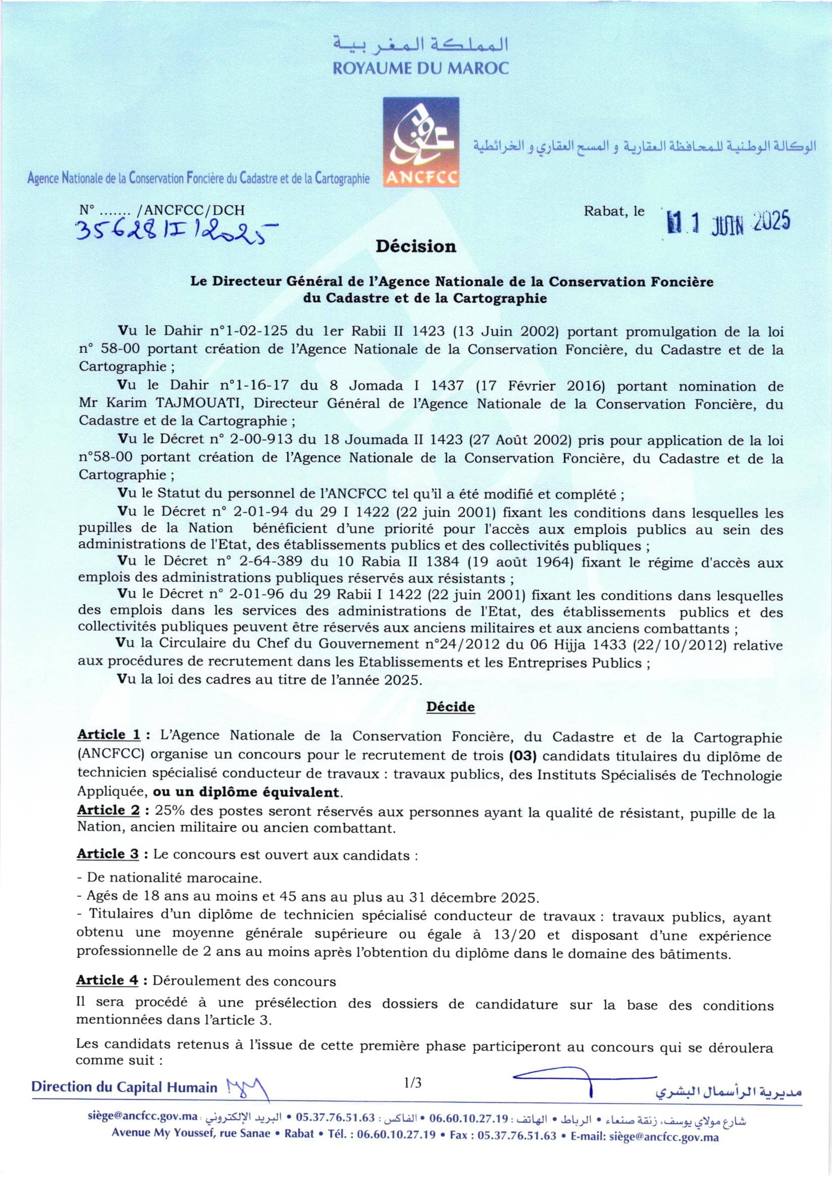 إعلان مباراة توظيف (3) تقني متخصص في قيادة الأشغال